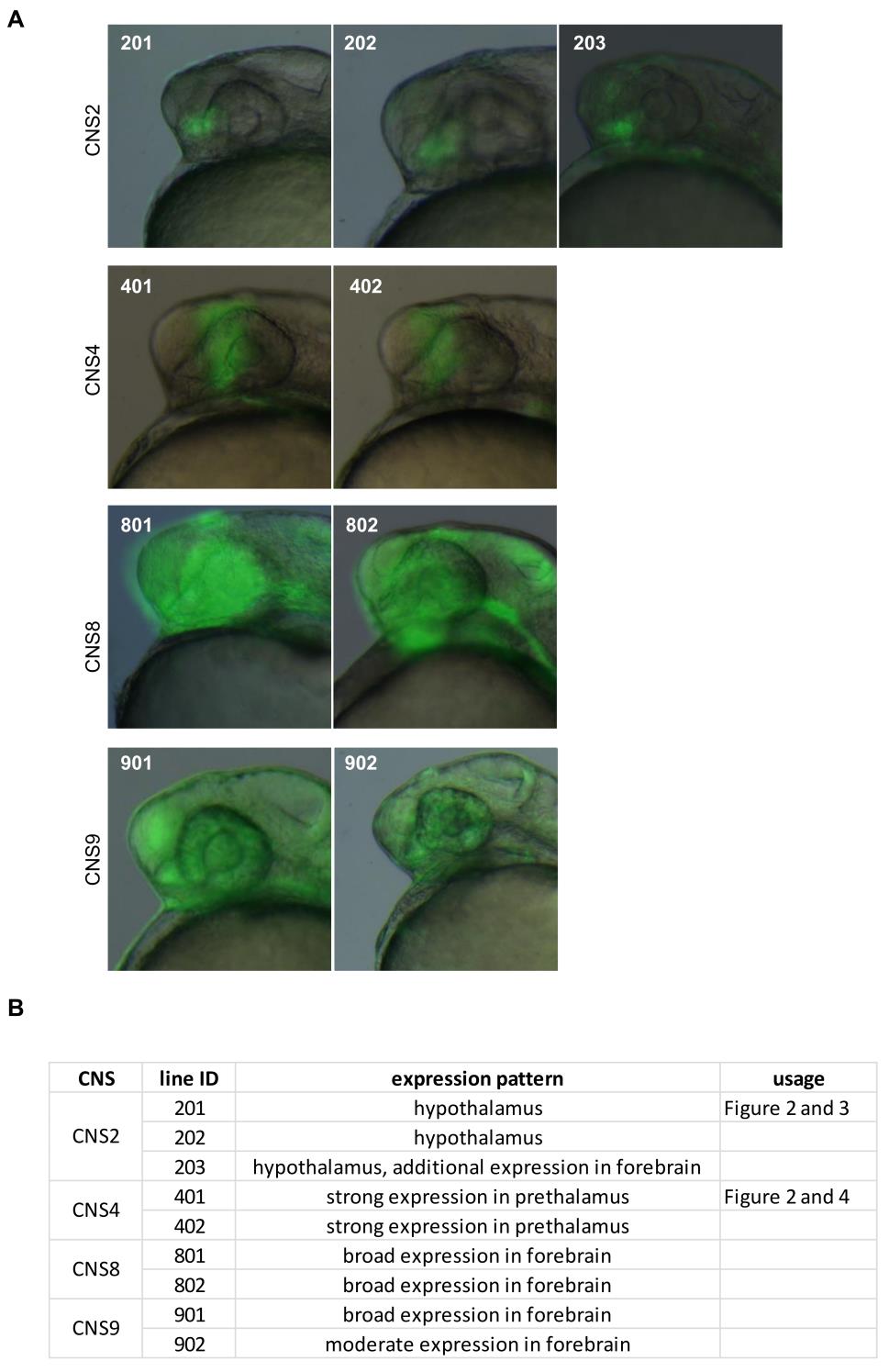 (A) Figure panels illustrate established transgenic lines carrying corresponding CNS elements. Line id is indicated on the upper left corner on the figure panel. Lateral view of the forebrain regions of embryos, anterior to the left. (B) Text description of the established transgenic lines. The line id used in experiments described in the Result section is indicated.