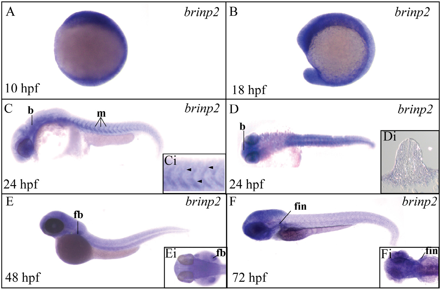 Spatial expression pattern of brinp2 during zebrafish development. brinp2 is ubiquitously expressed at 10–18 hpf (A, B). At 24 hpf, brinp2 is detected specifically in the developing brain (b) of younger embryos (C,D). Staining is concentrated at the myosepta (Ci), cross section of 24 hpf embryos also reveal that brinp2 is expressed in the muscle (Di). At 48 hpf, expression is broadly detected in the brain and in the fin buds (fb) (E, Ei). In older embryos (72 hpf) brinp2 is highly and preferentially expressed in the brain and fins (F, Fi). Lateral (C, E, F) and dorsal (D, Ei, Fi) views are shown.
