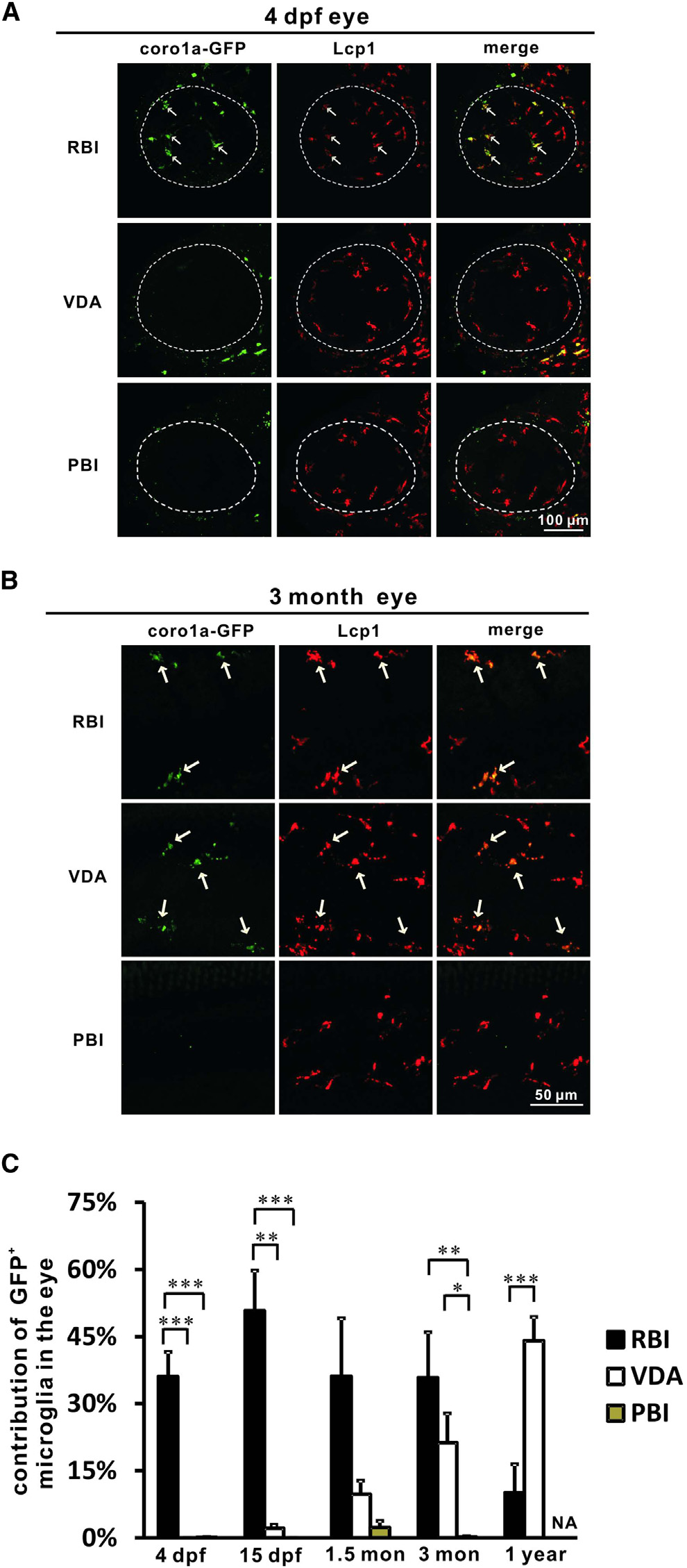 (B) The RBI- and VDA- but not PBI-region-derived cells (coro1a-GFP+ cells) constitute the major population of microglia (Lcp1+ cells) in the 3-month adult zebrafish eye. White arrows indicate the coro1a-GFP+ microglia in the eyes.