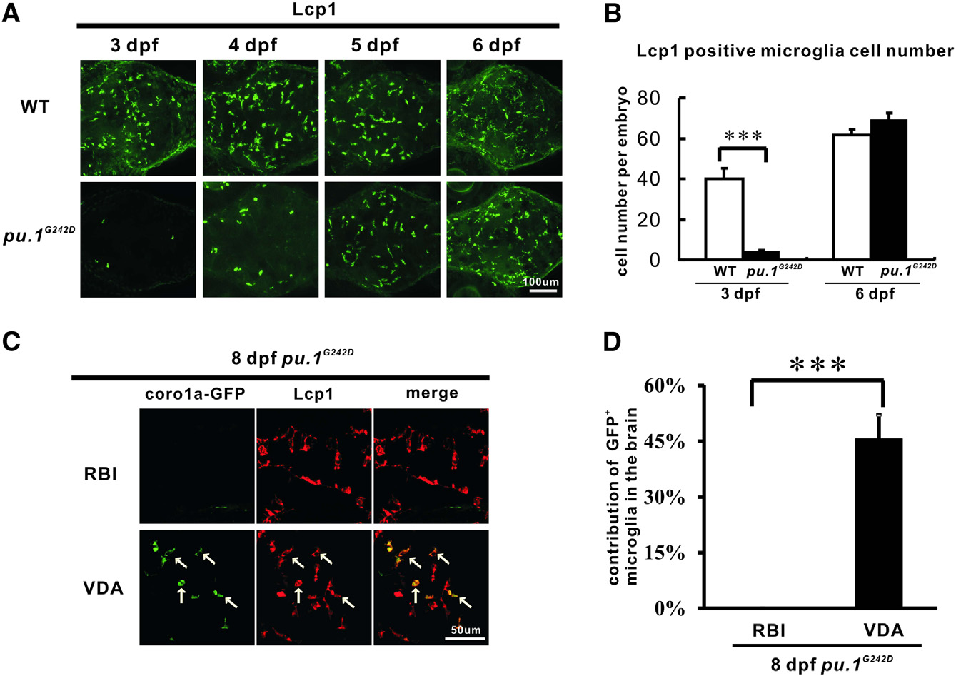 (D) Quantification of the contribution of RBI- and VDA-region-derived microglia in 8dpf pu.1G242D embryos. For the RBI- and VDA-region-labeled embryos, n = 3 and 6, respectively. Error bars represent mean ± SEM. p < 0.001.