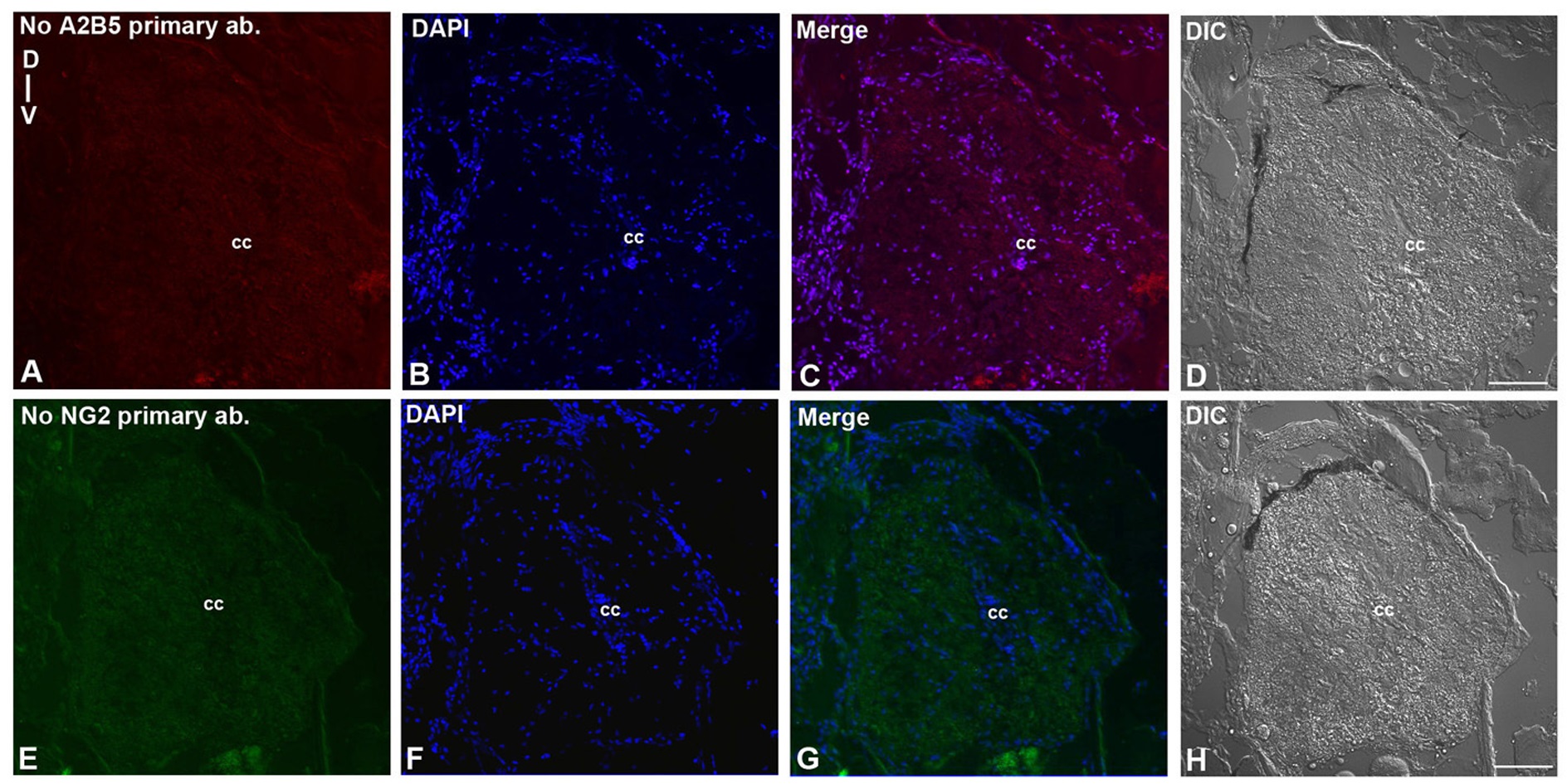 Immunohistochemistry of negative controls: A-D) Transverse section of a 7 dpi cord stained without primary antibody A2B5 for negative control in injured cord of Fig 2E. No primary antibody A2B5 (A), DAPI (B), Merge (C) and DIC (D). E-H) Transverse section of a 7 dpi cord stained without primary antibody NG2 for negative control in injured cord of Fig 2Q. No primary antibody NG2 (E), DAPI (F), Merge (G) and DIC (H). ‘cc’ denotes central canal of the cord. Scale bar = 30 µm.