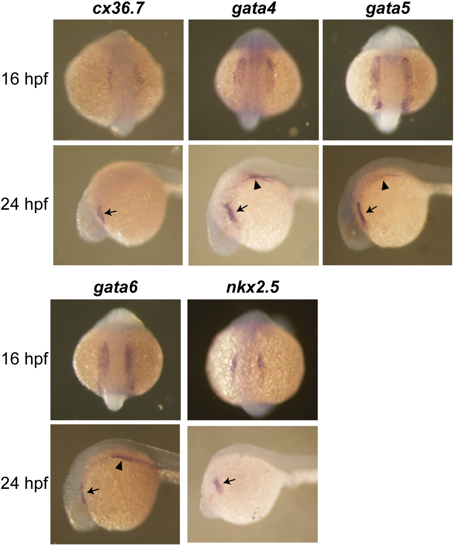 The expression of cx36.7, gata4, gata5, gata6 and nkx2.5 in zebrafish embryos. Whole mount in situ hybridization of zebrafish embryos at 16 hpf (top) and 24 hpf (bottom) was performed with antisense RNA probes specific to cx36.7, gata4, gata5, gata6 and nkx2.5. The cx36.7 expression was detected in the developing heart regions in which gata4, gata5, gata6 and nkx2.5 are expressed. Arrows, hearts; arrowheads, gut.