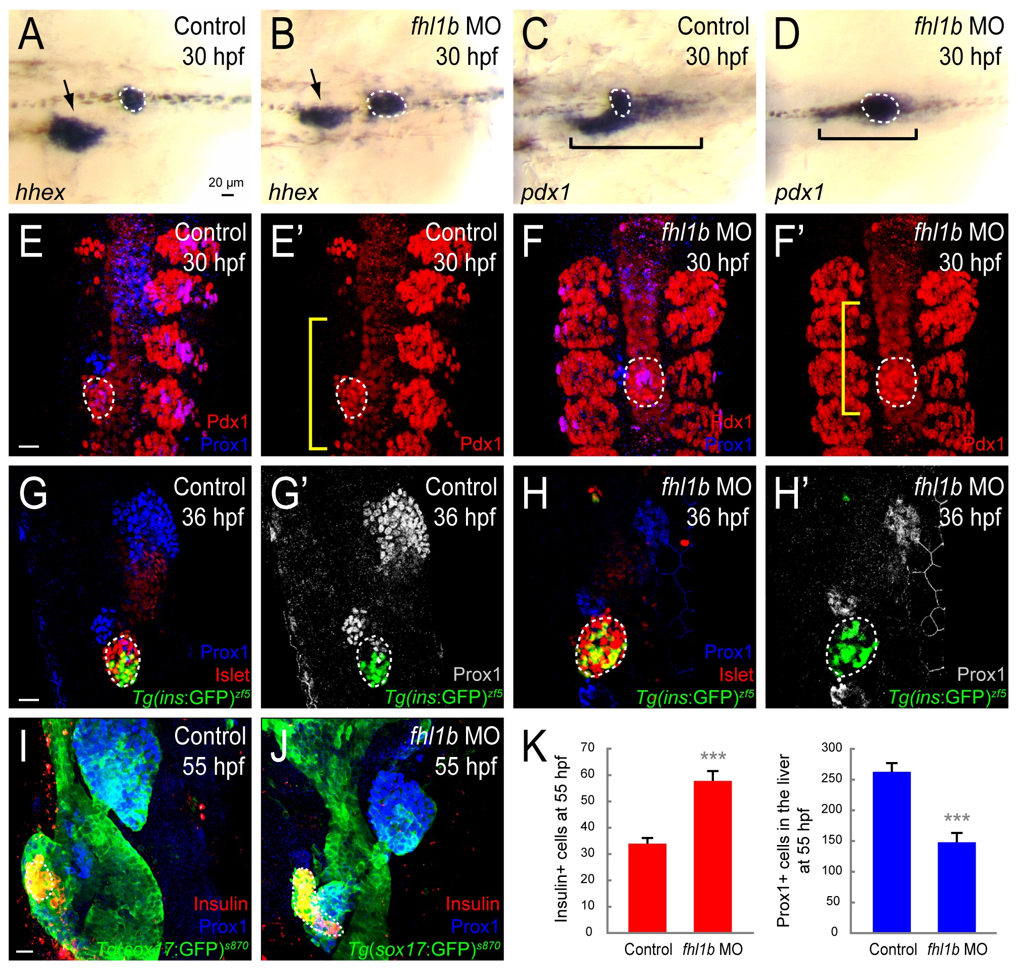 (A-D) Whole-mount in situ hybridization showing the expression of hhex (A and B) and pdx1 (C and D), comparing control embryos (A and C) and fhl1b morphants (B and D) at 30 hpf. hhex is expressed in the liver (black arrows) and the dorsal pancreatic bud (white dotted circles). pdx1 is expressed in the developing pancreas including the dorsal pancreatic bud (white dotted circles) and intestine (black brackets), but not in the liver. hhex expression was reduced in the liver of fhl1b morphants, while expanded in the dorsal pancreatic bud (B). pdx1 expression in the dorsal pancreatic bud was also expanded, while its expression in the intestinal bulb primordium appeared to be reduced in fhl1b morphants (D) compared to that of control embryos (C). (E–F′) Confocal images of control embryos (E and E′) and fhl1b morphants (F and F′) at 30 hpf, stained for Pdx1 (red; expression in the dorsal pancreatic bud is outlined by white dotted circles) and Prox1 (blue). The somites are also Pdx1 positive. Compared to that of control embryos (E and E′), in fhl1b morphants (F and F′), the Pdx1 expression domain in the dorsal pancreatic bud was expanded, while the Prox1 expression domain was reduced. Note that the Pdx1 expression domain in the intestinal primordium (yellow brackets) appeared to be decreased in morphants (F′). (G-H′) Confocal images of Tg(ins:GFP)zf5 control embryos (G and G′) and fhl1b morphants (H and H′) at 36 hpf, stained for Islet (red; expression in the dorsal pancreatic bud is outlined by white dotted circles) and Prox1 (blue in G and H; grey in G′ and H′). In fhl1b morphants (H and H′), the Prox1 expression domain was greatly reduced, whereas the number of Tg(ins:GFP)zf5- and Islet-expressing cells was increased. (I and J) Confocal images of Tg(sox17:GFP)s870 control embryos (I) and fhl1b morphants (J) at 55 hpf, stained for Insulin (red; outlined by white dotted circles) and Prox1 (blue). fhl1b morphants (J) continuously exhibited an enlarged Insulin-expressing β-cell population with a reduced number of Prox1-positive cells in the liver. (K) Quantification of the number (mean±SD) of Insulin-positive cells in the pancreas (red) and Prox1-positive cells in the liver (blue) at 55 hpf. 33.9±2.1 cells were Insulin-positive in control embryos, whereas 57.8±3.6 cells were Insulin-positive in fhl1b morphants. 148.0±15.2 cells expressed Prox1 in fhl1b morphants, while 262.7±14.0 cells were Prox1-positive in control embryos. Cells in 20 planes of confocal images from 5 individual embryos were counted. Asterisks indicate statistical significance: ***, P < 0.001. A-D, dorsal views, anterior to the left. E-J, confocal projection images, ventral views, anterior to the top. Scale bars, 20 µm.