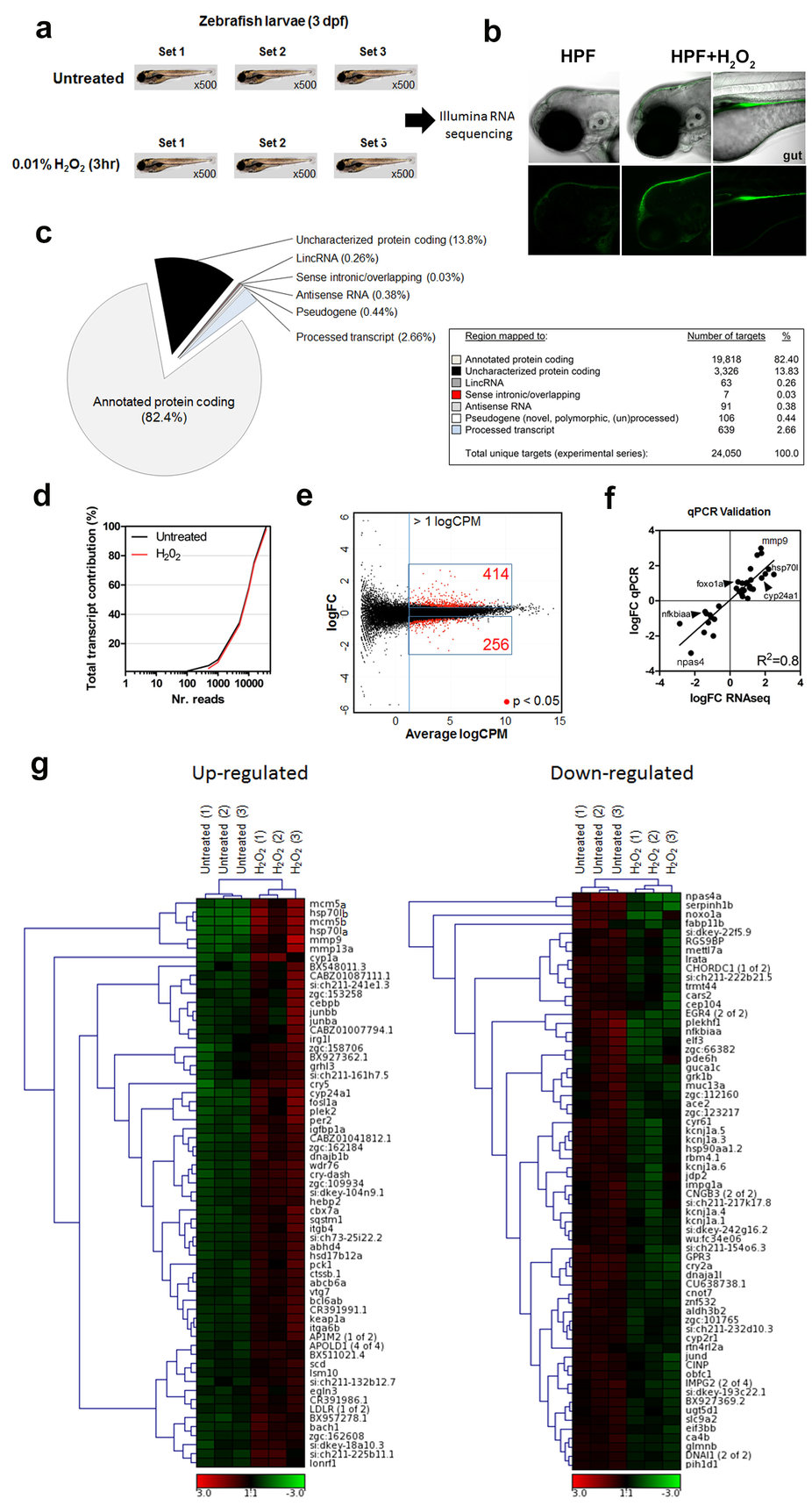 (a) Pools of ~500 larvae/set of 4 day-post-fertilized (dpf) zebrafish larvae were treated with 0.01% (3 mM) H2O2 for three hours and total RNA was subsequently collected followed by pair-end next generation RNA sequencing (n = 3 biological replicates). (b) H2O2 sensor (HPF) either alone or with H2O2 treatment shows that H2O2 is mostly retained in the skin epithelium (n = 5 fish). (c) Distribution of mapped reads in the zebrafish transcriptome. RNA-seq data sent to NCBI (GEO: GSE75728). (d) Transcript complexity between untreated and H2O2-treated larval zebrafish samples. Based on read CPM (counts per million), the left-most value on the X-axis represents the most highly expressed transcripts, which is incrementally summed with each successively lower expressed transcript (rightward). The y-axis (% contribution of the total transcripts) was calculated using: [CPM/sum of all CPM] x 100%. (e) RNA-seq data was normalized with the read CPM method of the number of mapped reads on gene exons. Transcript expression data transformed on M (log ratio of fold change) and A (mean average) scale. Boxed blue regions represent statistically significant transcripts (p < 0.05) returned by the test for differential expression. The MA-plot shows the log2 fold changes from the treatment over the mean of normalized counts, i.e. the average of counts normalized by size factor. Cutoff set to >1 log2 CPM averaged over all samples, and below the cutoff there is no real inferential power. Note: Statistical significance drops below the threshold. (f) Quantitative PCR validation of RNA-seq results of a sub-set of candidate targets. Full data set is presented in Table S7 (n = 3 biological replicates). (g) Heat map indicates unsupervised hierarchical clustering of the top (left) and bottom (right) most significantly enriched transcripts derived from the RNA-seq data after H2O2 treatment. Hierarchical clustering was performed between individual experiments and transcripts. The color key indicates the log2 CPM expression values. Abbreviations: HPF (hydrogen peroxide fluorogenic probe or pentafluorobenzenesulfonyl-fluorescein), CPM: Counts per million, FC: Fold-change.