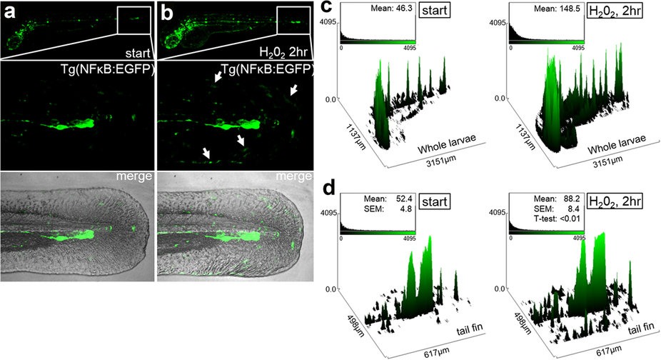 Transgenic NF-κB:EGFP zebrafish reveal peripheral NF-κB activation after H2O2 treatment Spatial patterns of increased NF-κB activation after H2O2 treatment of zebrafish larvae.