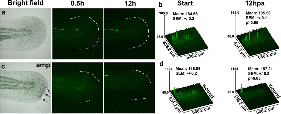 (a) The caudal fin of an uninjured EPRE:GFP larval zebrafish was imaged over the course of 12 hours. First and last images of the time-lapse sequence are shown. (b) Matching surface plots and quantification, comparing the fluorescence means of 4 individual fish (n = 4). Statistical significance was tested between first and last time points, showing lack of EPRE:GFP activation by 12 hours. (c) First and last image of a time-lapse sequence showing the amputated caudal fin (arrows) of an EPRE:GFP larval zebrafish. (d) Matching surface plots and quantification, comparing the fluorescence means of 6 individual fish, show that injury fails to activate EPRE:GFP.