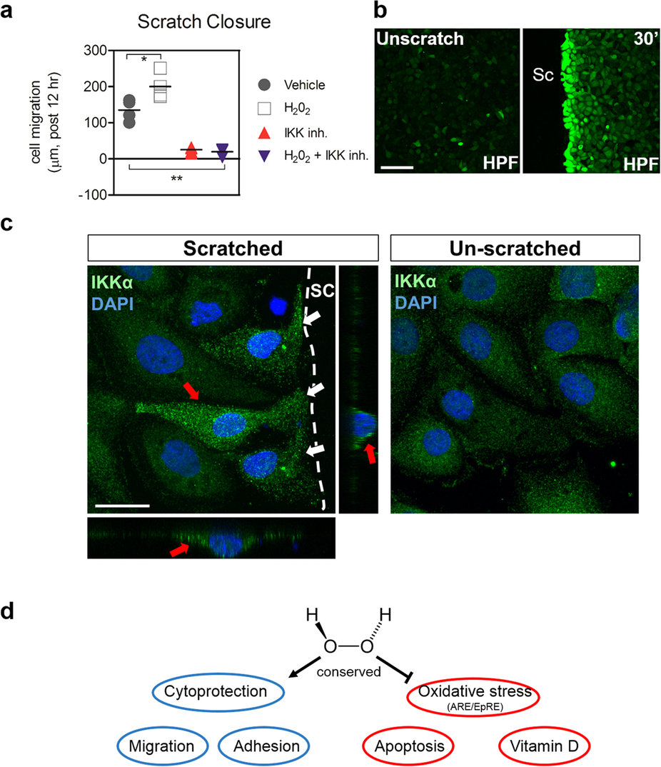 (a) IKK is necessary for H2O2-induced HEK01 keratinocyte migration after wounding. Scratch assays were performed with H2O2 (0.1 µM) and Wedelolactone (50 µM) using HEK01 cells. Two-way ANOVA at an alpha = 0.05 (95% confidence interval) and Bonferroni’s multiple comparison post-tests were utilized. Significance is denoted with asterisks: *p < 0.05, **p < 0.01 (n ≥ 3-5 cell culture experiments). (b) Rapid H2O2 production using 1 µM HPF (hydrogen peroxide fluorogenic probe) at the scratch (sc) margin of HEK01 keratinocytes within 30 minutes. Bar = 100 µm (c) Rapid subcellular accumulation of IKKα within injured HEK01 cells at the scratch (sc) margin (white arrows) after 30 minutes compared to unscratched cells. Orthogonal views (red arrows) of an injured cell show peri-nuclear and cytoplasmic distribution and accumulation of IKKα. Bar = 20 µm. (d) Schema of overall findings.