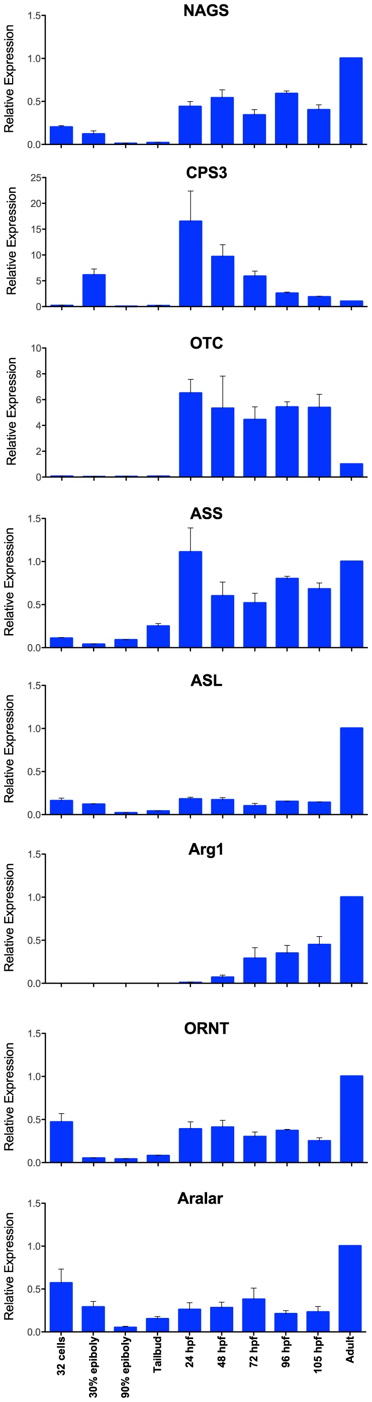 Relative expression of urea cycle genes in developing zebrafish. mRNA levels were measured at nine developmental stages: 32 cells, 30% epiboly (4.6 hpf), 90% epiboly (9 hpf), tailbud (10 hpf), 24 hpf, 48 hpf, 72 hpf, 96 hpf, 105 hpf, and normalized to the abundance of each mRNA in adult zebrafish. The scales of y-axes differ due to different expression patterns of zebrafish urea cycle genes.