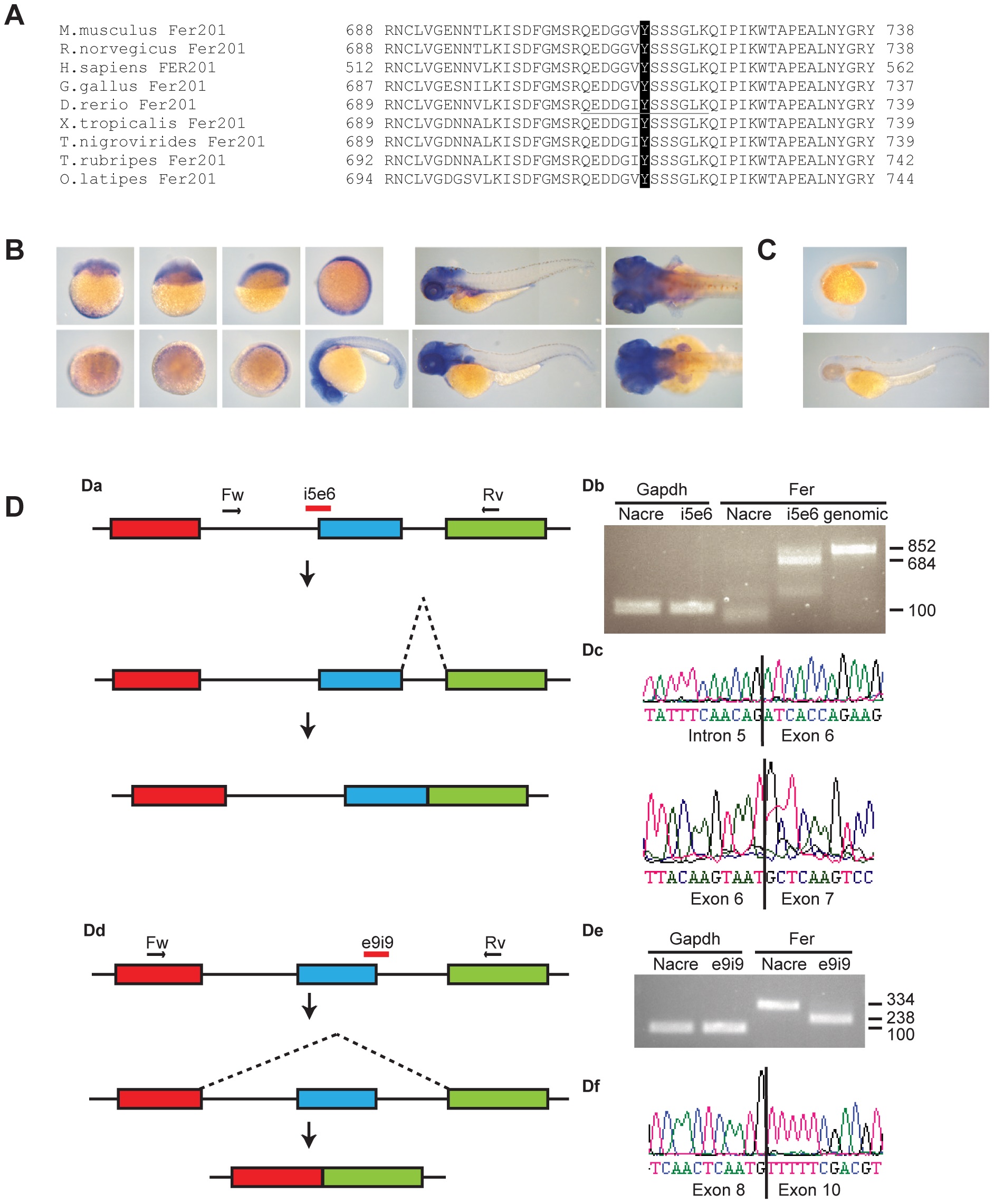 Fer expression in zebrafish embryos and Fer MO induced splicing defects. A. Alignment of zebrafish Fer kinase sequence encompassing the autophosphorylation site (black) that was identified by phosphoproteomics with the mammals M. musculus, R. norvegicus, H. sapiens, the avian G. gallus, the amphibian Xenopus tropicalis, and the fish Tetraodon nigrovirides, Takifugu rupripes and Oryzias latipes. B. fer expression during the first 24 hpf and at 3 dpf and 4 dpf was observed using in situ hybridization with an antisense fer probe. C. ISH with negative control sense fer probe. D. RT-PCR showing altered splicing of fer in MO injected embryos. Da. Model of altered splicing by Fer MO i5e6. Exons 5, 6 and 7 are indicated in red, blue and green, respectively. Primers used for RT-PCR are indicated as arrows. MO is indicated in red. Due to splice blocking, intron 5 is not spliced out of the processed mRNA. Db. RT-PCR showing gapdh control in Nacre (control) MO and Fer MO injected embryos. RT-PCR showing Fer product in Nacre control MO and Fer i5e6 MO injected embryos, and genomic DNA as a positive control. Dc. Sanger sequencing showing the inclusion of intron 5 and the normal splicing of exon 6 in the RT-PCR product. Dd. Model of altered splicing by Fer MO e9i9. Exons 8, 9 and 10 are indicated in red, blue and green, respectively. Primers used for RT-PCR are indicated as arrows. MO is indicated in red. Due to defective splicing, exon 9 is spliced out of the processed mRNA. De. RT-PCR showing gapdh control in Nacre (control) MO and Fer e9i9 MO injected embryos. RT-PCR showing Fer product in Nacre control MO and Fer e9i9 MO injected embryos with a decrease in size of the product in e9i9 MO injected embryos. Df. Sanger sequencing showing the exclusion of exon 9.