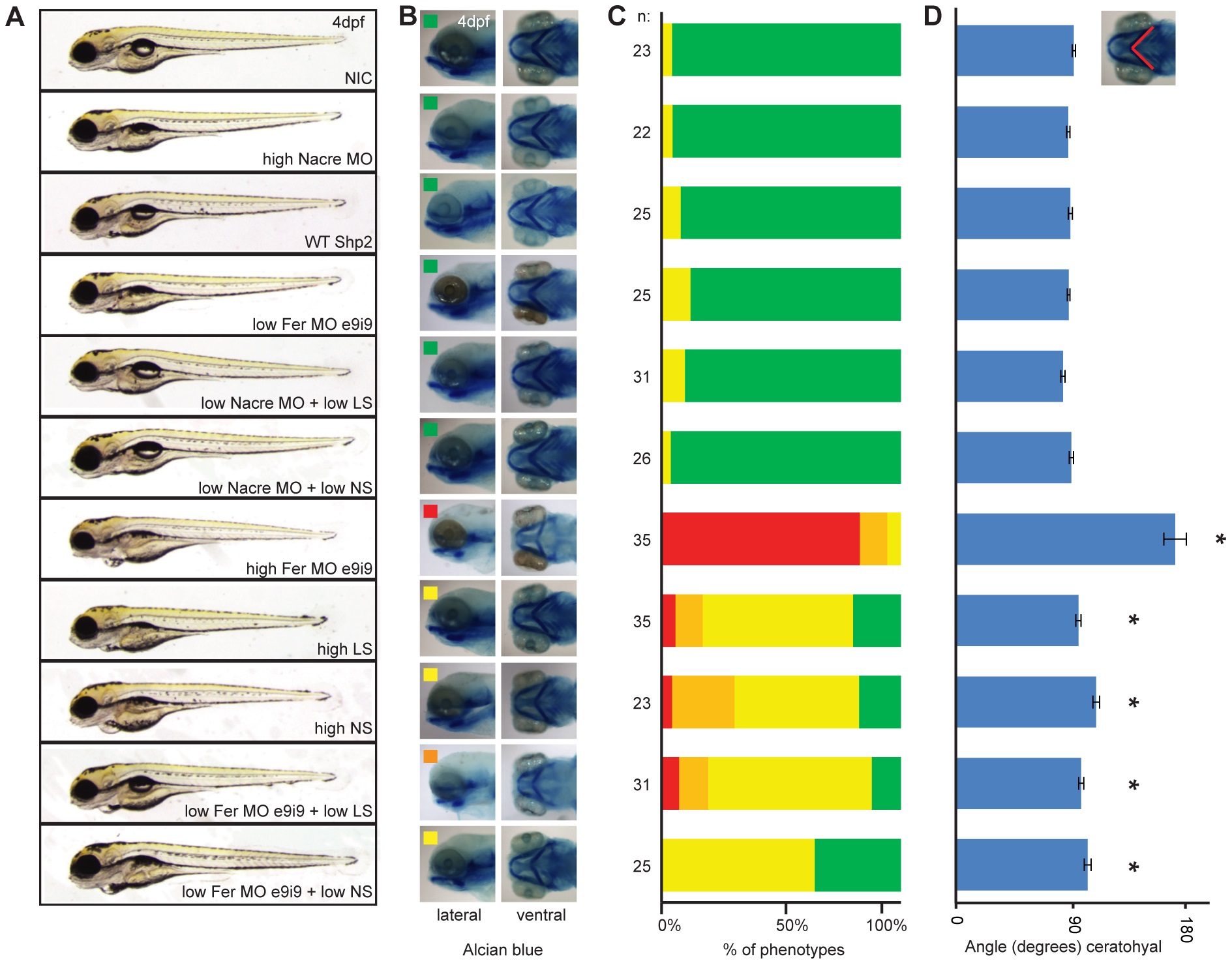 Partial knockdown of Fer cooperated with suboptimal expression of NS- and LS- but not WT Shp2 to induce developmental defects. A. Embryos were injected with control MO, Fer e9i9 MO and NS, LS or WT Shp2 mRNA as indicated, and imaged at 4 dpf. B. Alcian blue staining showing craniofacial defects scored on severity (green: wild type, yellow: mild phenotype, orange: moderate phenotype, red: severe phenotype). C. Embryos were scored based on craniofacial defect upon alcian blue staining. The number of embryos per condition is indicated. D. The angle of the ceratohyal was quantified as a measure of craniofacial defects (* p<0.005, Student′s t-test).