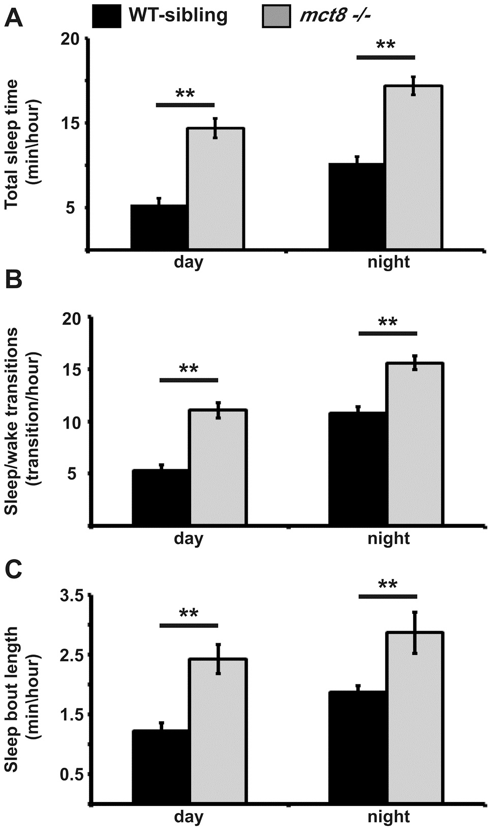Sleep architecture of mct8-/- larvae. A-C. Recording of sleep was performed in 6 dpf mct8-/- and WT-sibling larvae during 24 h under a 14 h light/10 h dark cycle. Total sleep time (A), the number of sleep/wake transitions (B) and sleep-bout length (C) monitored in mct8-/- and WT-sibling larvae. Values are represented as means±SEM (standard error of the mean). Statistical significance was determined by t-test: two-sample assuming unequal variances (** p<0.001).