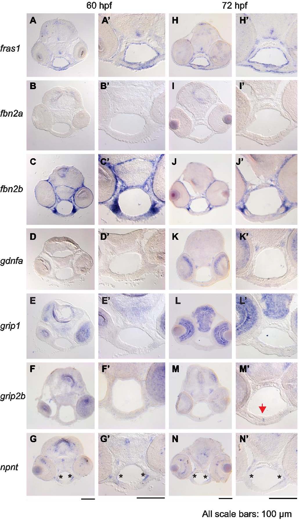 Expression of fras1-related and itga8-related genes in facial tissues. (A-N′) RNA in situ hybridization on wild type tissue sections at (A-G′) 60 hpf or (H-N′) 72 hpf. Each image in A-N shows a lower magnification image of individual sections and A′-N′ shows higher magnification images of these sections, focusing on the pharyngeal region. (A and H) fras1 expression in facial endoderm and ectoderm is shown as a positive control. (B and I) fbn2a shows no detectable facial expression. (C and J) fbn2b is strongly expressed in arch mesenchyme. (D and K) The fras1 processing gene grip1 is expressed in brain and eyes, but not in the pharyngeal regions. (E and L) Similarly, grip1 paralog grip2b is not visibly expressed in pharyngeal regions at 60 hpf (F), but is present by 72 hpf in the joint between the left and right Meckel’s cartilage (M, arrow). This suggests that genes other than grip1 and grip2b may process Fras1 in the face, or that earlier grip expression enables Fras1 processing. Two primer-sets failed to amplify grip2a cDNA at 3 dpf, so we did not assay facial expression of this gene. (G and N) npnt expression is most intense along the lateral edge of facial endoderm (asterisk), where the proposed Itga8-FPC interactions occur. All scale bars are 100 µm, applicable to their respective columns.
