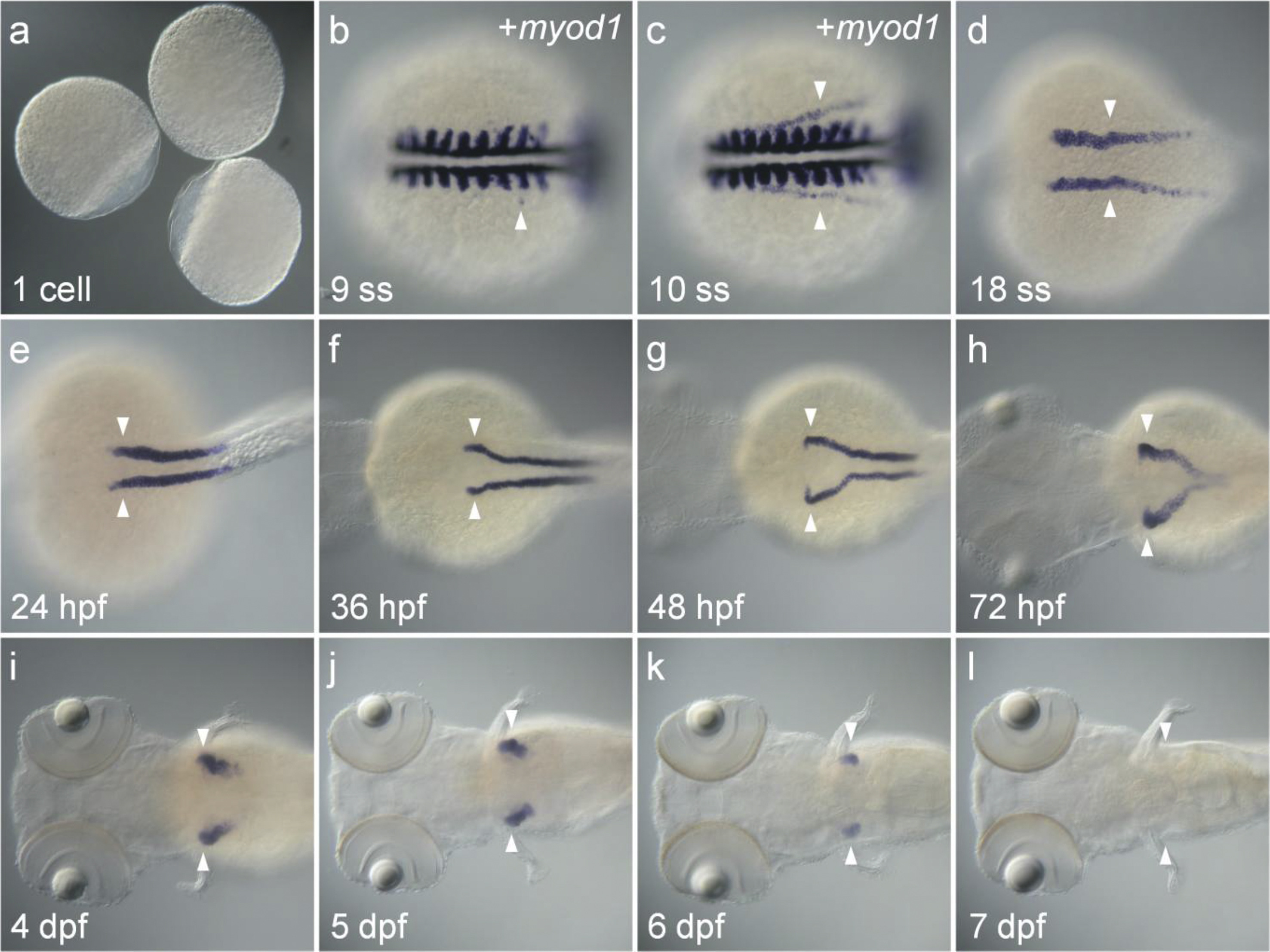 Pronephros-specific expression pattern of zaqp8b was analyzed by whole mount in situ hybridization. Dorsal view to the left (b-l). Staining without myod1 RNA probe (a, d-l) or co-staining with myod1 probe (b, c). (b) In 9 ss embryos, zaqp8b began to express in a subset of cells in IM (arrowhead). (c-g) Bilateral expression of zaqp8b in pronephros (arrowhead). (h-k) Expression of zaqp8b in the PCT (arrow head) from 72 hpf to 6 dpf. (l) The zaqp8b transcripts in the PCT almost completely disappeared at 7 dpf.