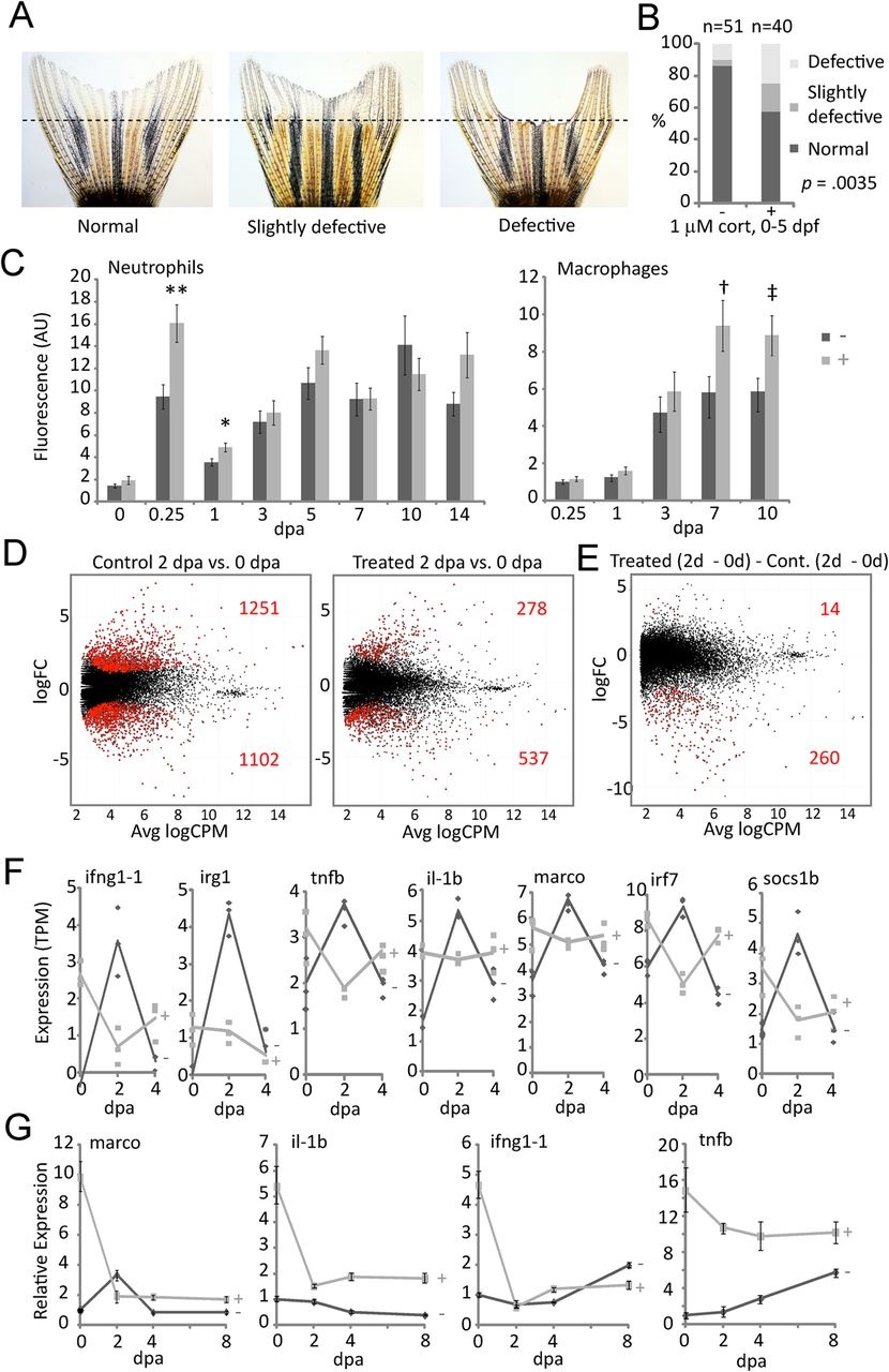 Effects of early developmental exposure to cortisol on adult tailfin regeneration. (A) Examples of morphologically normal, slightly defective and defective tailfin regeneration. (B) Quantification of combined data on regeneration morphology from three different experimental replicates from a single parental stock. Statistical significance was determined by a Chi-squared test (d.f.=1, comparing the total normal versus the total defective and slightly defective). Subsequent experiments using a newly imported parental stock did not show any overt morphological defects (possibly owing to the high polymorphism of the wild-type AB strain); however they did manifest the effects shown in panels C-F. (C) Quantification of neutrophils and macrophages in regenerating fin tissue (dpa, days post-amputation), respectively measured by fluorescence intensity of fins from mpx:GFP and mpeg1:YFP transgenic fish derived from untreated control embryos (-) or embryos treated with 1µM cortisol (+). In one experiment counts of individual cells at a single time point confirmed that the differences in fluorescence intensity reflect differences in cell number. The bars represent the grand means±s.e.m. of measurements from three experimental replicates of the neutrophil counts, and two experimental replicates of the macrophage counts (a third macrophage experiment which did not show significant differences was not included, as it did not include the same time points). For the neutrophils the number of fish in each replicate ranged from 9-18, with overall totals of 41 control and 37 treated. For the macrophages the number of fish in each replicate ranged from 9-11, with overall totals of 21 control and 18 treated. Statistical significance **P=0.0017; *P=0.01; †P=0.028; ‡P=0.0226, by a two tailed t-test. (D) Scatter plots of average expression level and fold-change in expression for each gene in tailfin regenerates at 2dpa compared to 0dpa in 4.5-month-old control (untreated) fish and fish derived from cortisol-treated embryos. The red dots indicate genes with significant differential expression (P<0.05), the numbers of which (over- and under-expressed) are also shown in red. (E) Scatter plot of average expression level and fold-change in expression, showing interaction of cortisol treatment and time (0-2dpa). Red dots indicate genes with significant differential expression (P<0.05), the numbers of which (over- and under-expressed) are also shown in red. (F) RNA-seq time course measurements of seven of the most significantly differentially expressed genes from the analysis shown in E; lines show the averages of three biological replicates, each of which are indicated by individual data points for both cortisol treatment (+, light gray) and untreated control (-, dark gray) groups. (G) qRT-PCR time course measurements of four of the genes shown in (F), during tailfin regeneration in 10month old adults from the same cohort shown in D-F.
