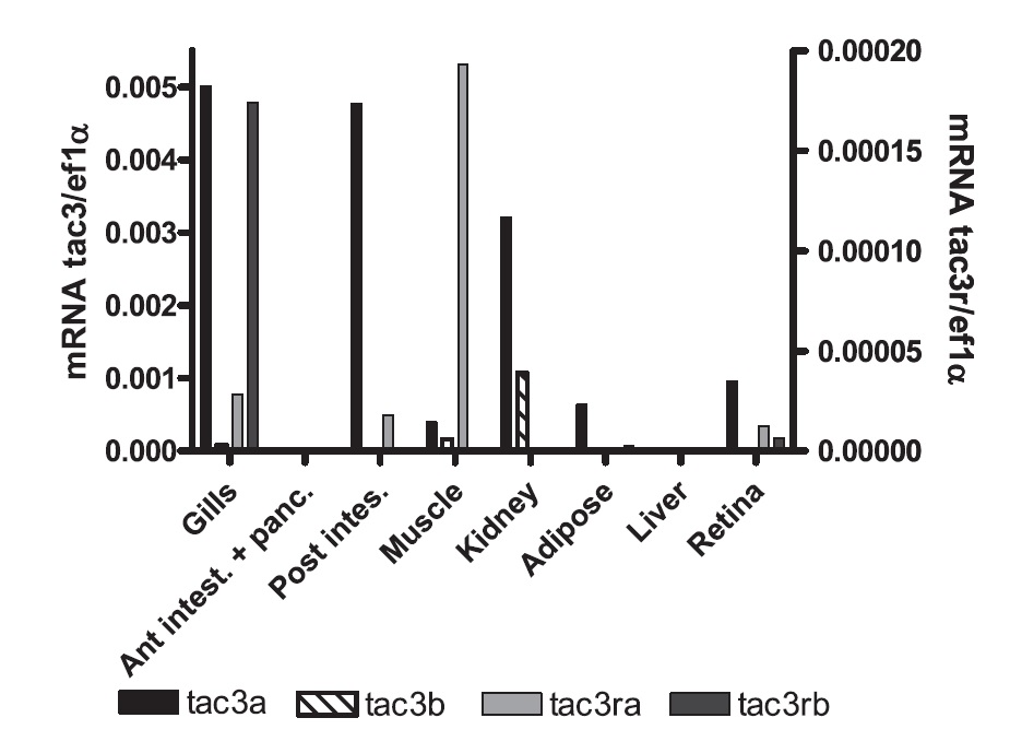 Localization by real-time PCR of zebrafish tac3a, tac3b, tac3ra, and tac3rb mRNA in various tissues. The relative abundances of the mRNAs were normalized to the amount of elongation factor 1-α (ef1α) by the comparative threshold cycle method, where the comparative threshold reflects the relative amount of the transcript. Ant. Intest+ panc., anterior intestine and pancreas; post. Intes, posterior intestine. We found low levels of mRNA expression of all four transcripts in the liver, retina, and adipose tissue. However, relatively high mRNA levels of tac3a and tac3rb were expressed in the gills, tac3a in the posterior intestine and tac3ra in the muscle.