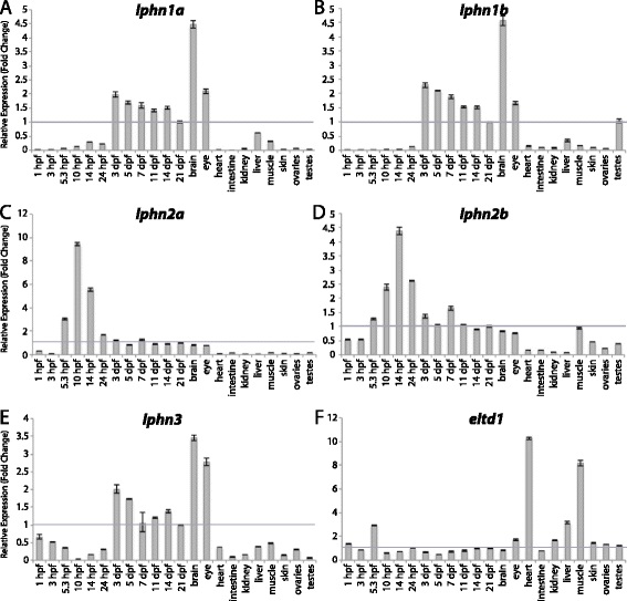 Group I aGPCR expression data. (A-F) Relative expression of zebrafish Group I aGPCRs obtained with high-throughput quantitative real-time PCR from a collection of 12 developmental time-points and 10 adult tissues. (A) lphn1a, (B) lphn1b, (C) lphn2a, (D) lphn2b, (E) lphn3, (F) eltd1. Error bars display the upper (RQmax) and lower (RQmin) limits of possible relative quantification values. Fold changes shown are relative to expression at 21 dpf (denoted by gray line at y = 1).