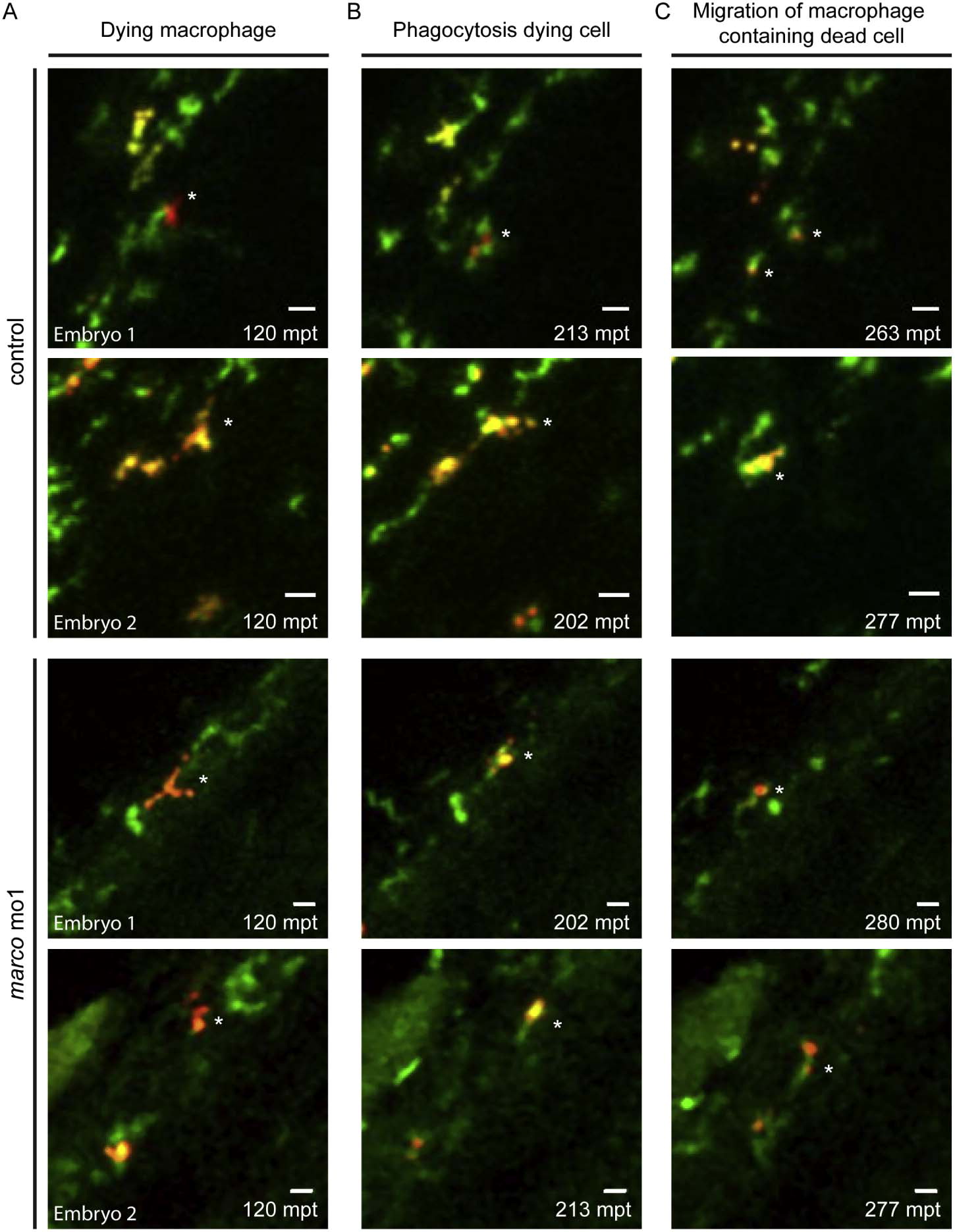 Morphants of marco are capable of phagocytosing dead cells. Phagocytosis of dying cells by macrophages was monitored in time. marco morphants and their controls were imaged after metronidazole treatment which induces nitroreductase-mediated cell ablation in a subpopulation of macrophages (mCherry positive cells). All macrophages express GFP. Time points represented are (A) time of nitroreductase-positive cells undergoing cell death, (B) phagocytosis of the dying cells by healthy GFP-positive macrophages and (C) migration of the macrophage containing the dead cell. Time lapse recordings were made of 4 embryos per group and examples of phagocytosis are shown for 2 control embryos en 2 marco morphants. Quantification of phagocytosis events are shown in Supplementary Fig. S2B. Asterisks indicate the phagocytosing macrophage; mpt: minutes post treatment.