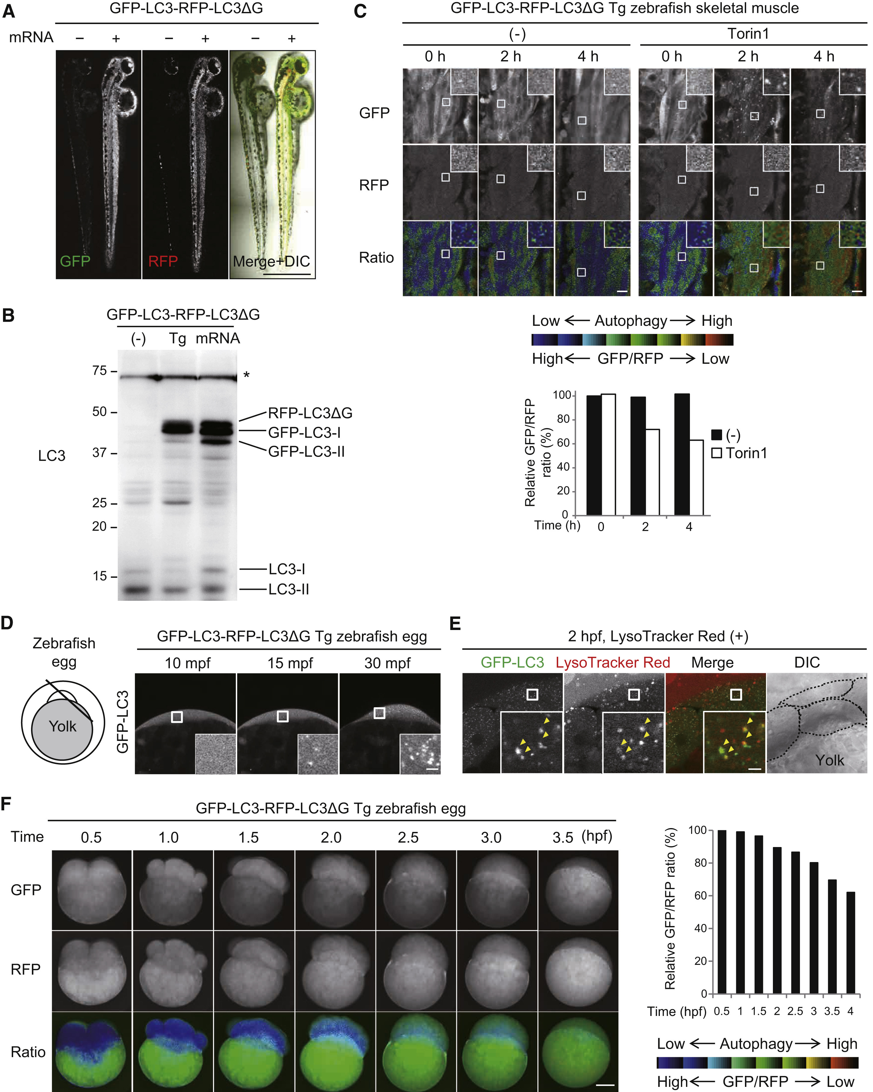 (F) Representative time-lapse images of fertilized eggs of GFP-LC3-RFP-LC3ΔG transgenic zebrafish at the indicated times (hpf). Scale bar, 200 μm. The graph shows the GFP/RFP fluorescence ratio in the blastomere as a percentage relative to that at 0.5 hpf.