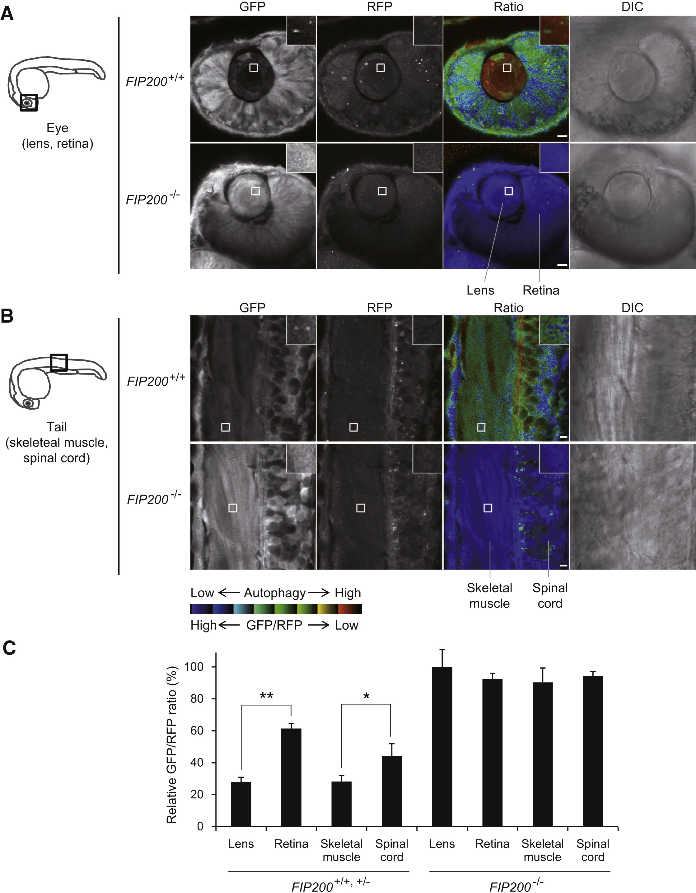 (A and B) A schematic diagram of 1 dpf zebrafish and representative images of GFP and RFP fluorescence signals and DIC in the eye (lens and retina) (A) and tail (skeletal muscle and spinal cord) (B) of FIP200+/+ and FIP200−/− zebrafish embryos injected with GFP-LC3-RFP-LC3ΔG mRNA. Images of the indicated regions are shown in the insets. Scale bar, 10 μm.