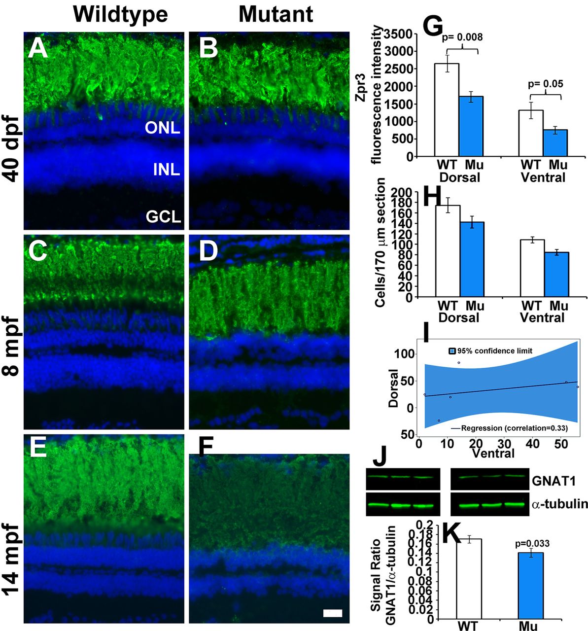 Rod photoreceptors degenerate in older EYS-deficient zebrafish. (A-F) Retinal sections were stained with Zpr3 and counter stained with DAPI. (A,B) Zpr3 staining of wild-type and EYS-deficient zebrafish at 40 dpf. (C,D) Zpr3 staining of wild-type and EYS-deficient zebrafish at 8 mpf. (E,F) Zpr3 staining of wild-type and EYS-deficient zebrafish at 14 mpf. (G) Quantification of Zpr3 immunofluorescence intensity of wild-type and EYS-deficient zebrafish at 14 mpf. (H,I) Rod quantification in wild-type and EYS-deficient zebrafish at 14 mpf. Rod cells in dorsal and ventral retina near the optic nerve heads were counted on H&E stained sections from sex- and body weight-matched animals. (J,K) GNAT1 western blot and quantification at 14 mpf. Western blot was carried out with GNAT1 and α-tubulin antibodies. Note that no significant differences were observed between wild-type and EYS-deficient zebrafish at 40 dpf and 8 mpf. However, Zpr3 immunoreactivity, rod cell numbers and GNAT1 protein were reduced in EYS-deficient zebrafish at 14 mpf. Scale bar for A-F: 20 µm. Error bars in G,H,K indicate s.e.m.