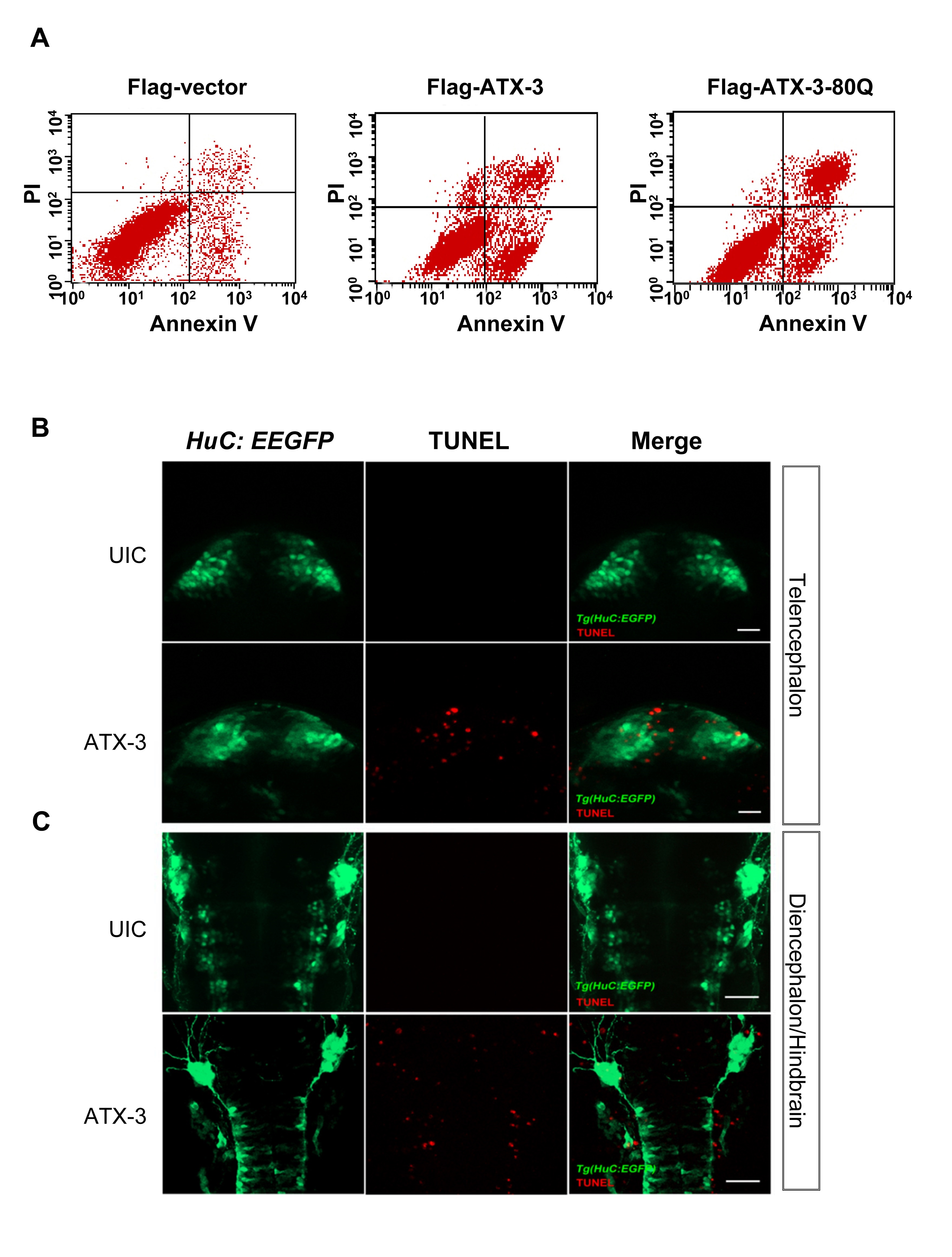 (A) Flow cytometry analysis using Annexin V-FITC/PI staining in HCT116 p53+/+ cells. (B and C) Dorsal views with anterior to the top of Tg(HuC:EGFP) embryos. Colocalization of HuC:EGFP (green) and TUNEL positive foci (red) in the telencephalon region (B) and diencephalon/hindbrain (C). Tg(HuC:EGFP) transgenic embryos uninjected control (UIC) or injected with ataxin-3 were collected for TUNEL staining at 24 hpf. Scale bars, 20 μm for B and 50 μm for C.