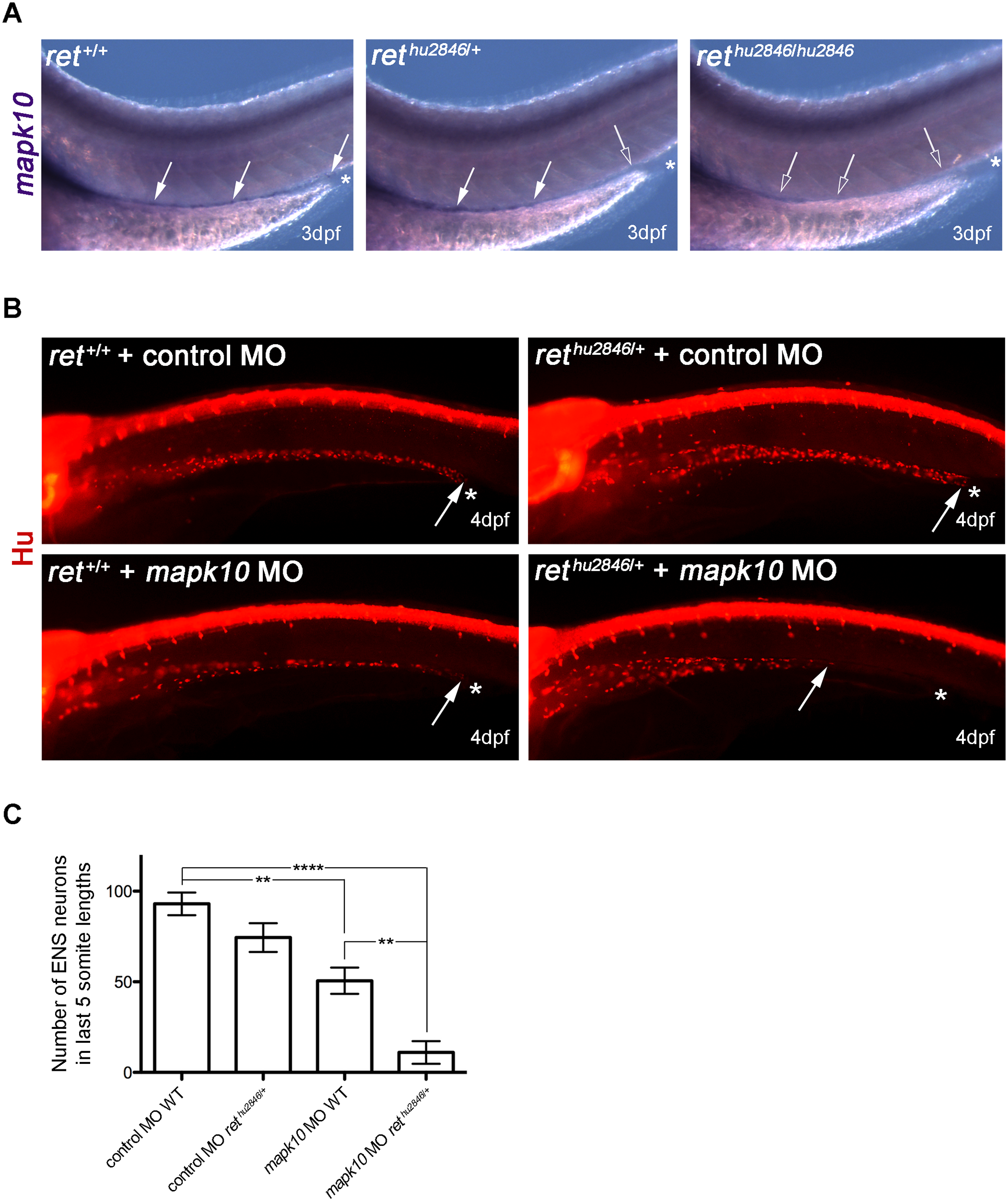 (A) RNA in situ hybridization shows mapk10 expression correlates with location of the ENS in WT (ret+/+), rethu2846/+, and rethu2846/hu2846 3dpf larvae (asterisks indicate end of gut, filled arrows indicate mapk10+ cells, and open arrows denote gut areas lacking mapk10+ cells). (B) MO gene knock-down of mapk10 (using a splice blocking MO, mapk10MO) performed on embryos from WT x rethu2846/+ cross to allow knock-down in both WT and rethu2846/+ embryos, and compared to a control MO. Immunostaining with HuC/D at 4dpf shows that most severe phenotypes are observed when mapk10MO is injected into rethu2846/+ embryos. Asterisks indicate end of gut tube (anal pore), and arrows denote position of last HuC/D+ neuron. (C) Quantification of neuron number in the last 5 somite lengths shows that injection of mapk10MO into WT embryos causes a modest, statistically significant reduction of enteric neurons in the gut relative to WT larvae injected with control MO (one-way ANOVA, p<0.001; Bonferroni’s post-hoc test, p = 0.0033), revealing a role for mapk10 in normal ENS development. Injection of mapk10MO into rethu2846/+ embryos causes severe reduction of enteric neurons, which is statistically different from either rethu2846/+ injected with control MO (one-way ANOVA, p<0.001, Bonferroni’s post-hoc test, P<0.0001) or mapk10MO injected into WT embryos (one-way ANOVA p<0.001, Bonferroni’s post-hoc test p = 0.006).