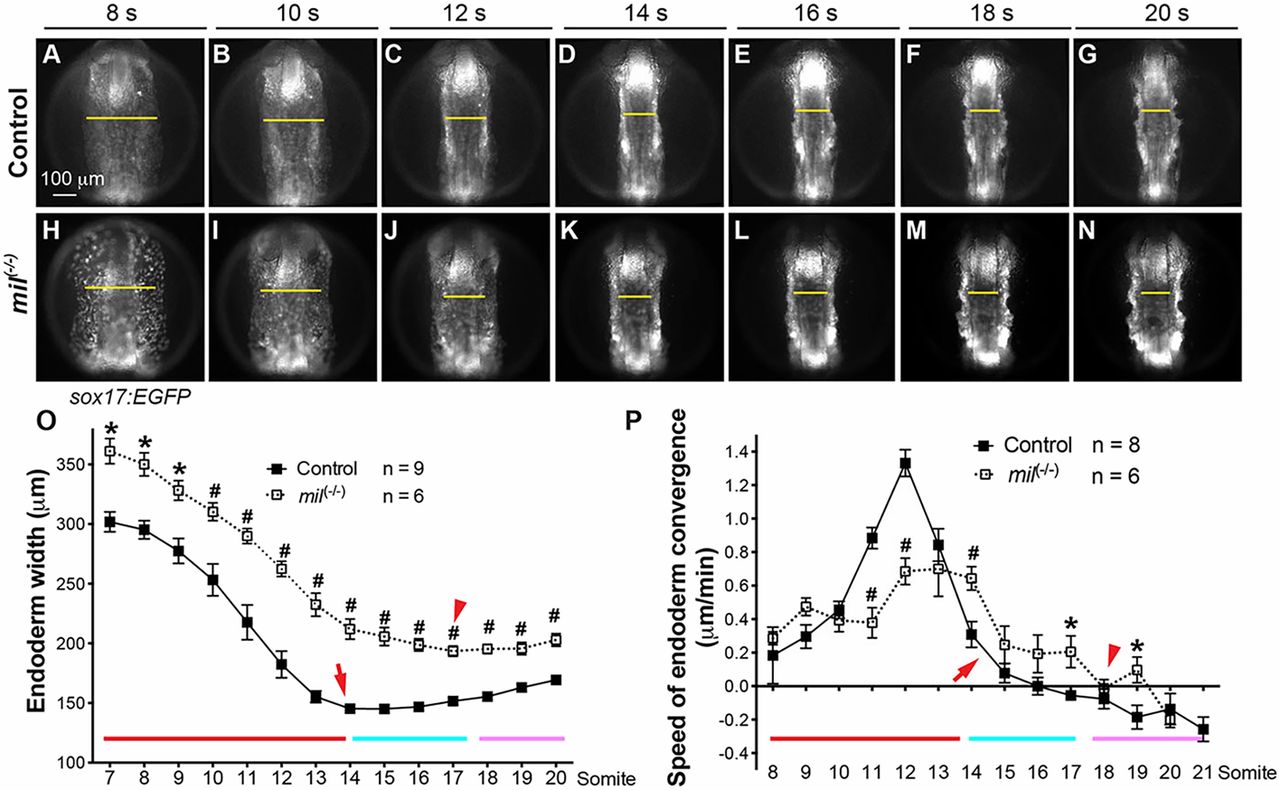 S1pr2 is required for efficient endoderm convergence during segmentation. Epifluorescence time-lapse experiments were performed on control and mil mutant embryos (supplementary material Movie 1). (A-N) Snapshots of the anterior endoderm from the movies, at the stages indicated. Dorso-anterior views; yellow lines (equivalent length for embryos at the same stage), width of the anterior endodermal sheet, showing that the endodermal sheet was wider in mutant. (O,P) The average endoderm width (O) and convergence speed (P). Red, cyan and pink lines represent the periods of rapid convergence, little convergence and expansion, respectively. Arrows and arrowheads mark completion of convergence. *P<0.05; #P<0.01 versus control. Data are mean±s.e.m.