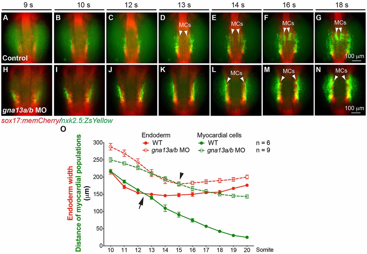 Gα13 is required for all stages of myocardial migration. Epifluorescence time-lapse experiments performed on the embryos indicated (supplementary material Movie 2). (A-N) Snapshots of the anterior endoderm and myocardial cells from the movies at the stages indicated. Dorso-anterior views. White arrowheads indicate myocardial cells (MCs). (O) Endoderm width (red) and the distance between the two populations of myocardial cells (green) at the stages indicated. Black arrow and arrowhead denote the timepoints at which myocardial precursors were dissociated from the endoderm in the control and gna13a/b MO-injected embryos, respectively. Data are mean±s.e.m.