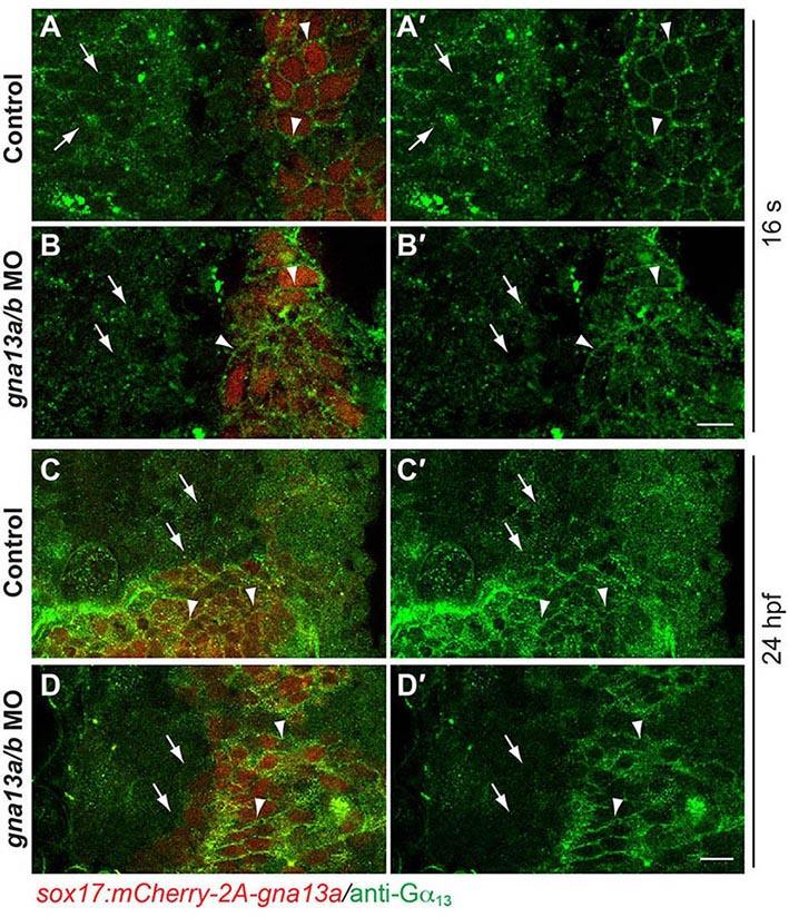 Transgenic Gα13 expression in the endoderm is resistant to injection of gna13a/b MO. Single confocal Z-planes of the anterior region of embryos in control and gna13a/b MO-injected Tg(sox17:mcherry-2A-gna13a) embryos at 16s and 24 hpf, showing Gα13 expression (green). Arrowheads: endodermal cells (red); arrows: non-endodermal cells. Scale bar: 20 μm.