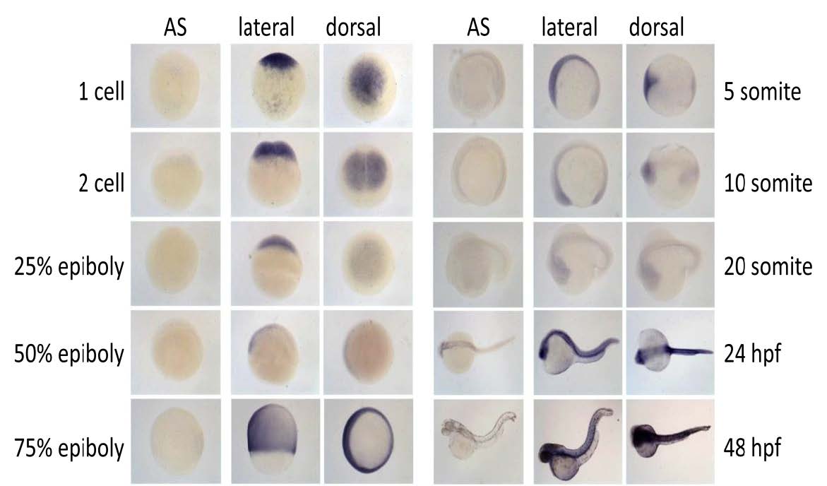 Dock4a is expressed during zebrafish embryogenesis. Gene expression was determined using in situ hybridization. Wild-type zebrafish embryos were harvested and fixed at the stages indicated, from the 1-cell stage to 48 hpf. Embryos were hybridized to either a sense (control) probe or an antisense digoxygenin labeled RNA probe. Embryos were photographed with lateral or dorsal views as indicated (sense is a lateral view).