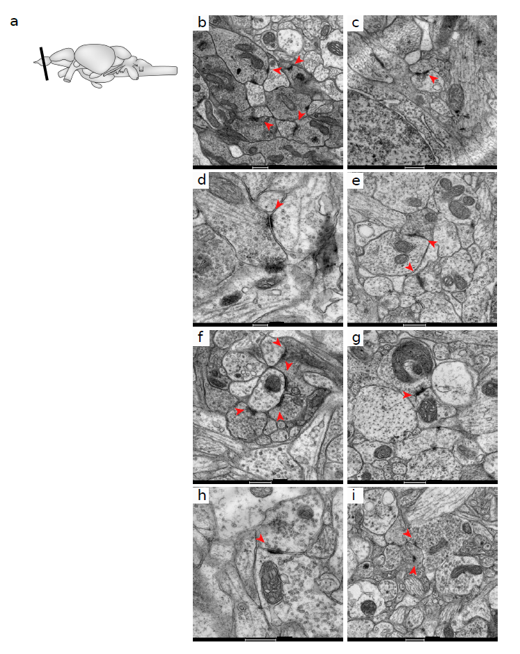 (a) Schematic representation of the zebrafish brain. The black line indicates the position of the olfactory bulb. (b-i) PSDs found in different areas of the olfactory bulb. Arrowheads indicate PSDs from dendro-dendritic synapses. Scale bars b-c and e-i 500 nm; scale bar d 200 nm.