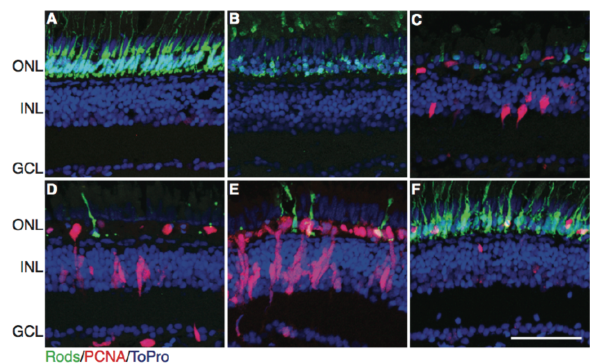 Tg(zop:nfsb-EGFP)nt19 fish were placed 38 in egg water containing 10mM Metronidazole and treated for 24 hours, then 39 returned to normal egg water to recover. Eyes were removed and proliferation 40 assessed by PCNA staining. Times of recovery observed were pretreatment (A), 0h. 41 recovery (B), 52h. recovery (C), 72h. recovery (D), 96h. recovery (E), and 28 days 42 recovery (F). Scale bar is 100μm.