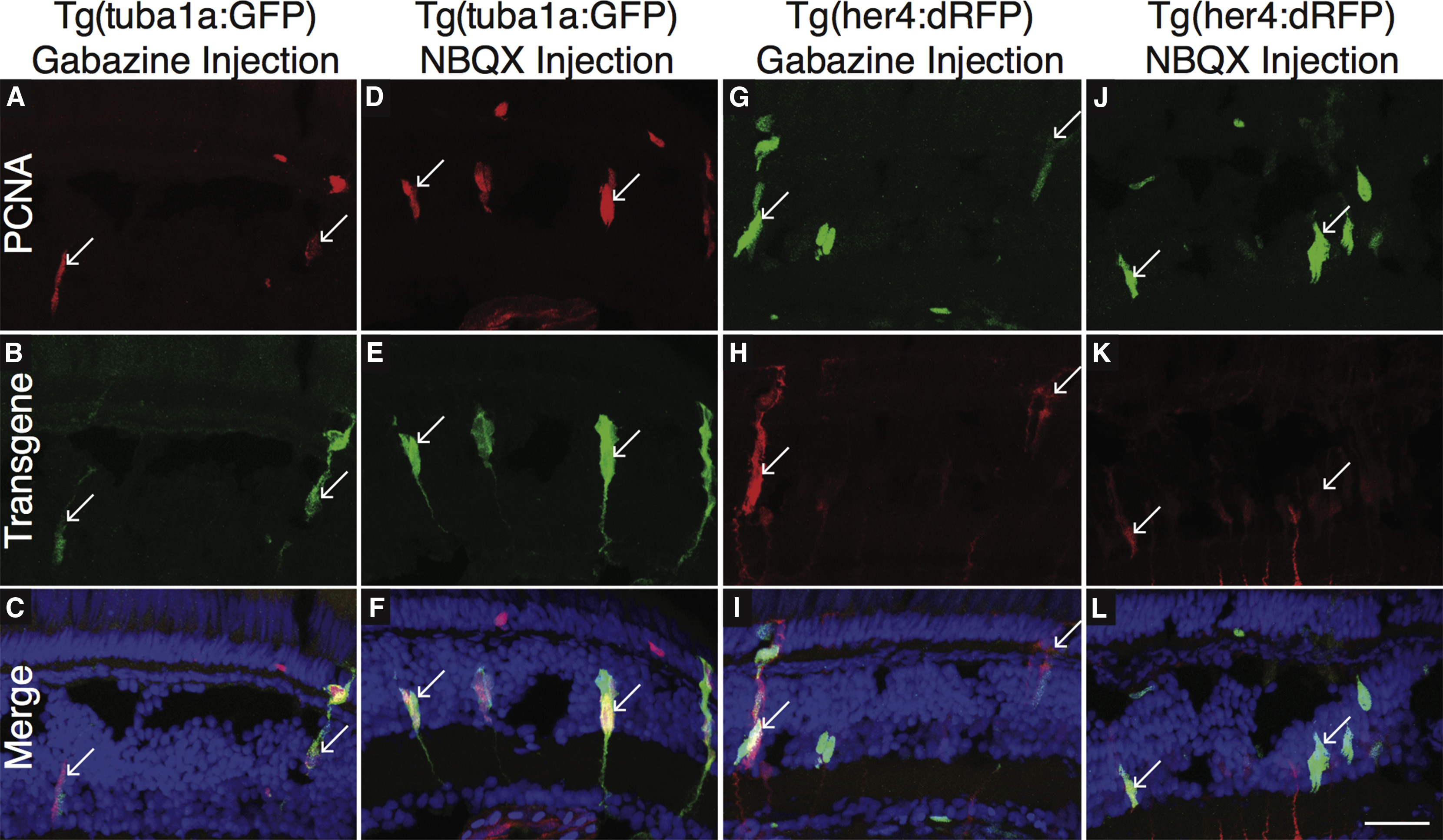 Gabazine (A–C, G–I) or NBQX (D–F, J–L) was injected into one eye of Tg(tuba1a:GFP) (A–F) or Tg(her4:dRFP) (G–L) fish. Fish were allowed to recover for 72 hr, after which retinas were removed and stained for PCNA. Both GFP and dRFP expression co-labeled with PCNA. Arrows indicate co-localization of transgene and PCNA. Scale bar, 100 μm.