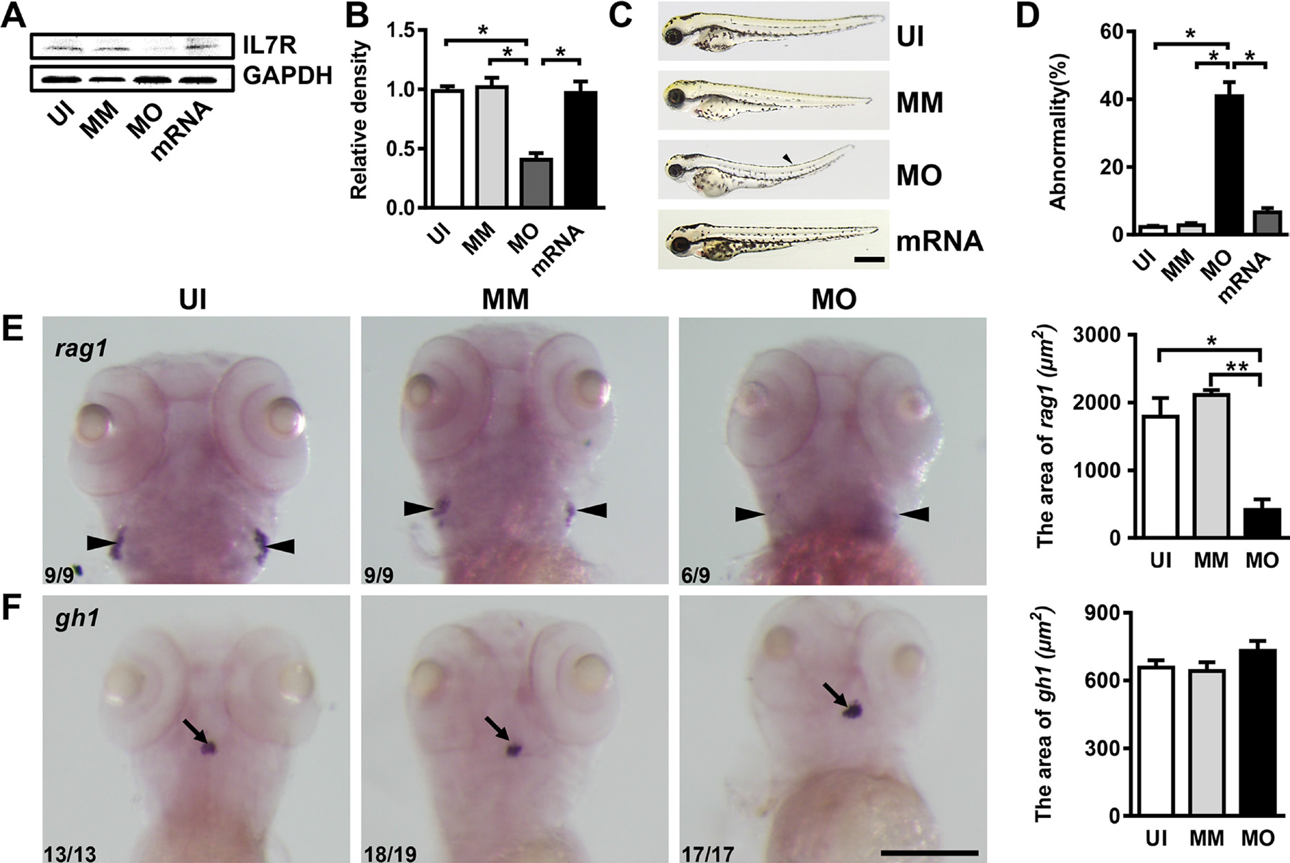 IL-7R-targeted morpholino oligonucleotides cause abnormal phenotypes and affect thymus development. (A) The expression of IL-7R protein of uninjected (UI), mismatch control (MM), IL-7R-morphant (MO) and IL-7R-rescue (mRNA) groups at 72 hpf. (B) Note that the IL-7R protein expression was significantly suppressed in IL-7R-morphants (ANOVA, *P < 0.05). (C) The gross development of UI, MM, MO and IL-7R-rescue (mRNA) embryos at 72 hpf. Some of the IL-7R-morphants show a slight curve in body axis (arrowhead). (D) The rate of abnormal phenotype increases in MO group (ANOVA, *P < 0.05). (E and F) The images of whole mount in-situ hybridization with mRNA probes recombination activating gene 1 (rag1) and growth hormone1 (gh1) in UI, MM and MO at 5 dpf. E. Note that the expression of rag1 is significantly decreased in IL-7R morphants (E; ANOVA, *P < 0.05, **P < 0.01) while the gh1 positive signals are similar among all three groups (F). Scale bar: C. 500 μm; E. and F., 200 μm.