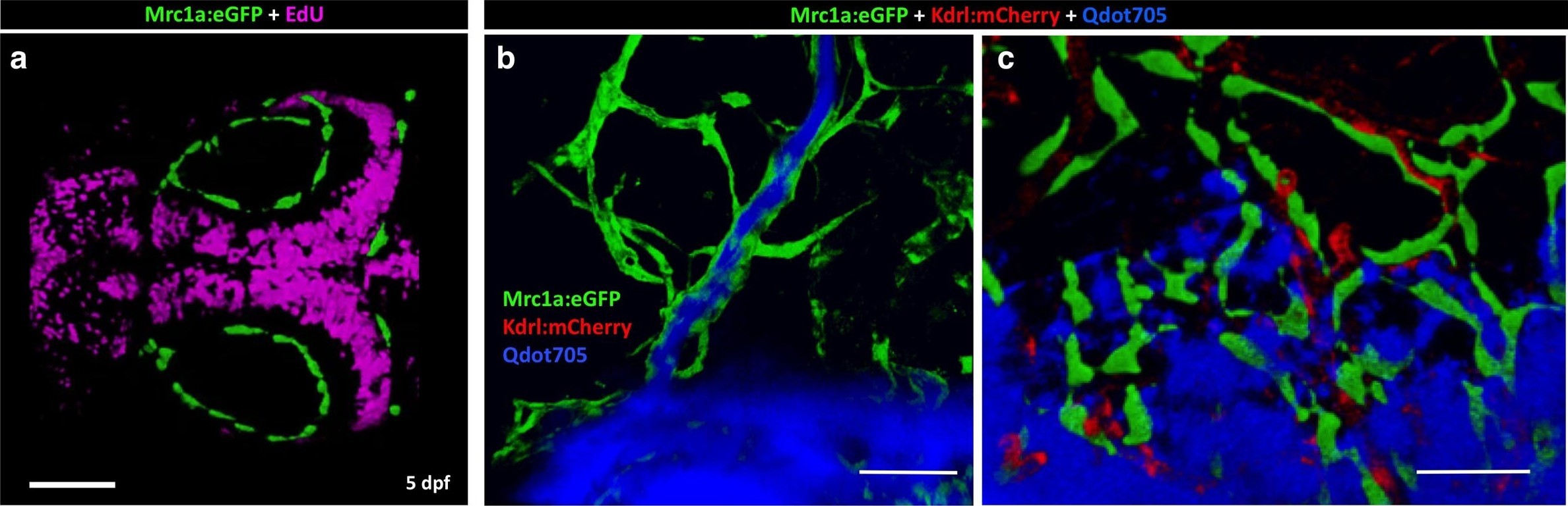 (a) EdU staining (magenta) of a 5 dpf Tg(mrc1a:eGFP) transgenic embryo where Mrc1a:eGFP-positive cells (green) are not EdU positive (n = 5 animals). Rostral is to the left. (b) Lymphatic vessel (green) on the head of a juvenile Tg(mrc1a:eGFP) transgenic animal showing lymphatic drainage of injected Qdots-705 (blue). (c) FGPs (green) on the brain surface of a Tg(mrc1a:eGFP) transgenic juvenile do not drain injected Qdots-705 (blue). n = 2 injected fish. Scale bars: 100 µm.