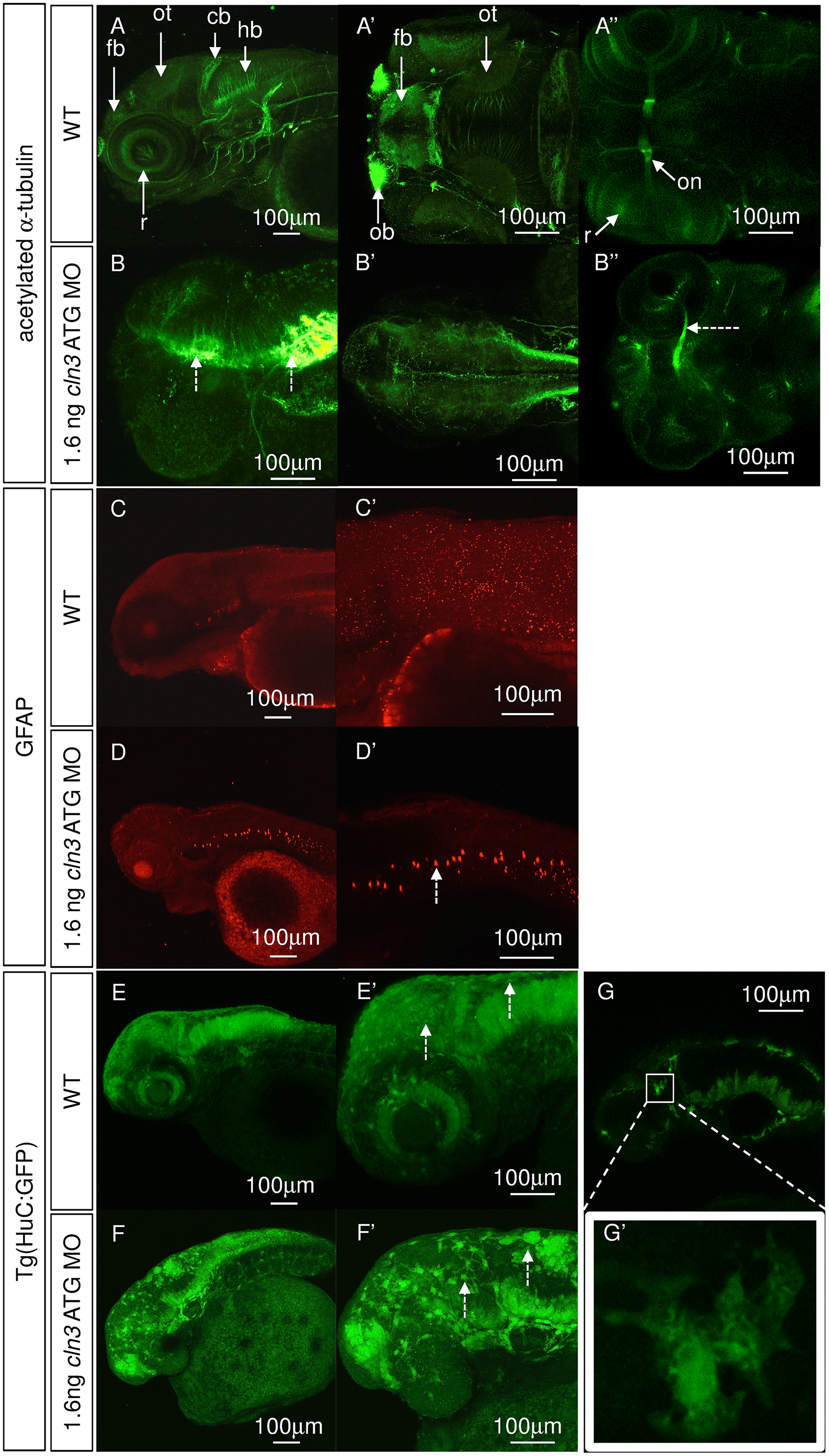 (A-A'', B-B'') Immunohistochemical staining for axons (acetylated α-tubulin) at 4 dpf. (A-A'') normal development of axons in WT larvae. (B-B'') 1.6 ng cln3 ATG MO morphants have a complete absence of axonal organisation throughout the brain, with axonal accumulation (B, dashed arrows), loss of the optic tectum and a narrowing of the optic nerve (B'', dashed arrow). (A-A'', B-B''), anterior to the left; A, B, lateral view, dorsal up; A', B', dorsal view; A'', B'' ventral view. (C-C', D-D') Immunohistochemistry using antibodies to glia (glial fibrillary acidic protein, GFAP) at 4 dpf. (C-C'') Normal staining in WT larvae. (D-D') Ectopic GFAP is observed in the notochord in 1.6 ng cln3 ATG MO morphants (dashed arrow). Lateral view. Anterior to the left. Dorsal up. (E-E', F-F', G-G') Transgenic zebrafish expressing GFP under the control of the HuC promoter in neurons were injected with 1.6 ng cln3 ATG MO and observed at 3 dpf. (E-E') In WT zebrafish, the normal structure of the developing brain and retina can be observed. (F-F') In morphants, there appear to be fewer neurons and the normal brain structure is lost. Many GFP-positive cells were enlarged and found nearer the surface of the brain (F', dashed arrows). (G-G') When the morphology of these enlarged cells was examined further, they lacked typical neuronal morphology. Lateral view. Anterior to the left. Dorsal up. Abbreviations: cb, cerebellum, fb, forebrain; hb, hindbrain; ot, optic tectum; on, optic nerve. A-G'' (all images) Z projection. Scale bars: 100 μm. n = 4 per group.