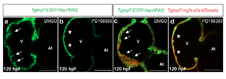 (a-d) Confocal sagittal sections of Tg(myl7:EGFP-Hsa.HRAS) (a-b) or Tg(myl7:EGFPHsa. HRAS);Tg(myl7:nrg2a-p2a-tdTomato) (c-d) hearts, treated with DMSO (a and c) or the Erbb2 inhibitor PD168363 (b and d) showing that nrg2a overexpression-induced cardiomyocyte multilayering requires Erbb2 function; asterisks and arrows indicate singlelayered and multilayered ventricular walls, respectively; V: ventricle, At: atrium; scale bars, 50 μm.