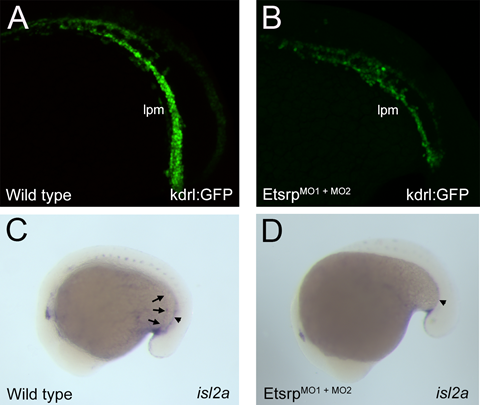 Knockdown of etsrp (etv2) and expression of isl2a A-B) Expression of the vascular endothelial transgenic marker Tg(kdrl:GFP)la116 is reduced by morpholino knockdown of etsrp. C-D) Expression of isl2a is reduced with morpholino knockdown of etsrp (arrows mark lateral plate expression which is strongly reduced with etsrp loss, arrowhead marks midline expression).