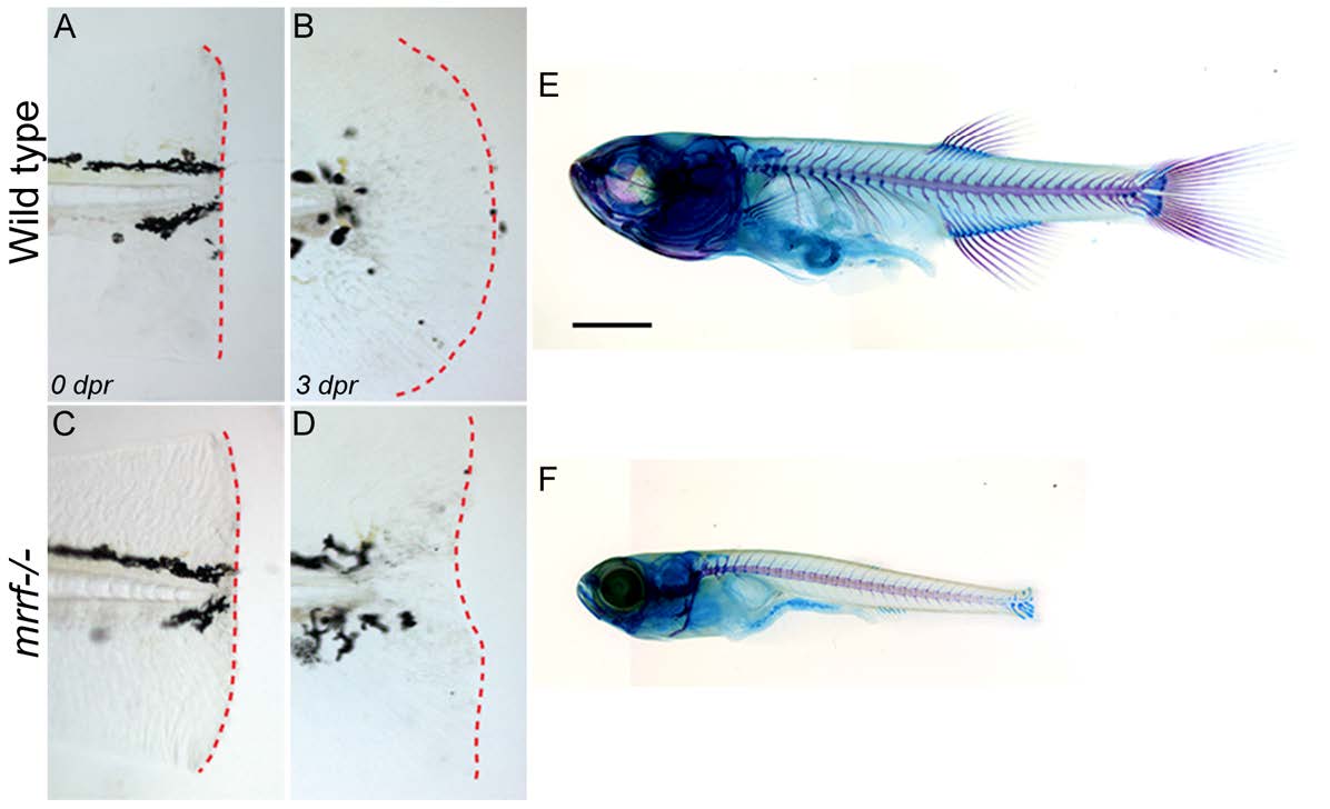 Fig. S2 Growth delay and defective fin regeneration in mrrf mutants. (A-D) Wild-type and mrrf-/- embryos had their tail fins amputated at 3 dpf. The dotted red lines show the caudal extent of the tail fin and the lack of regeneration in mutants 3 days post-resection (dpr). (E and F) Alcian blue and Alizarin red staining of cartilage and bone, respectively, show a severe growth defect in mrrf mutants at one month of age. Scale bar = 100 μm.