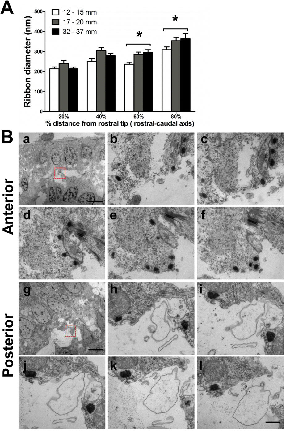 (A) Comparison across three TL groups at four distances from the rostral end (0%, 20%, 60% and 80% distances) of the sensory epithelium (ribbon number observed at the four distances: n = 52, 36, 33 and 22, respectively, for 12–15 mm TL fish; n = 22, 24, 39 and 30, respectively, for 17–20 mm TL fish; and n = 52, 30, 37 and 16, respectively, for 32–37 mm TL fish). *P < 0.05, post hoc tests within each distance between the indicated TL groups. (B) Representative TEM images of serial sections. The HCs of the anterior saccule contained small ribbons that were close to each other (a–f), in contrast to the large, rounded and dispersed ribbons observed in HCs in the posterior saccule (g–l). The red rectangles in (a,g) indicate the regions that were magnified and observed in the serial sections (b–f and h–l, respectively). Scale bars: 5 μm (a and g); 500 nm in all magnified images.