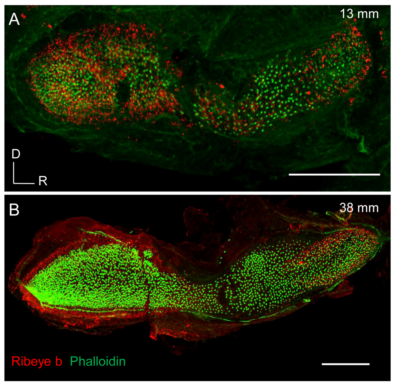 Immunofluorescence labelling for Ribeye b. Representative images of saccules from young (A) and old zebrafish (B) showing Ribeye b expression (red) and hair bundles stained with phalloidin (green). Scale bars: 100 μm.