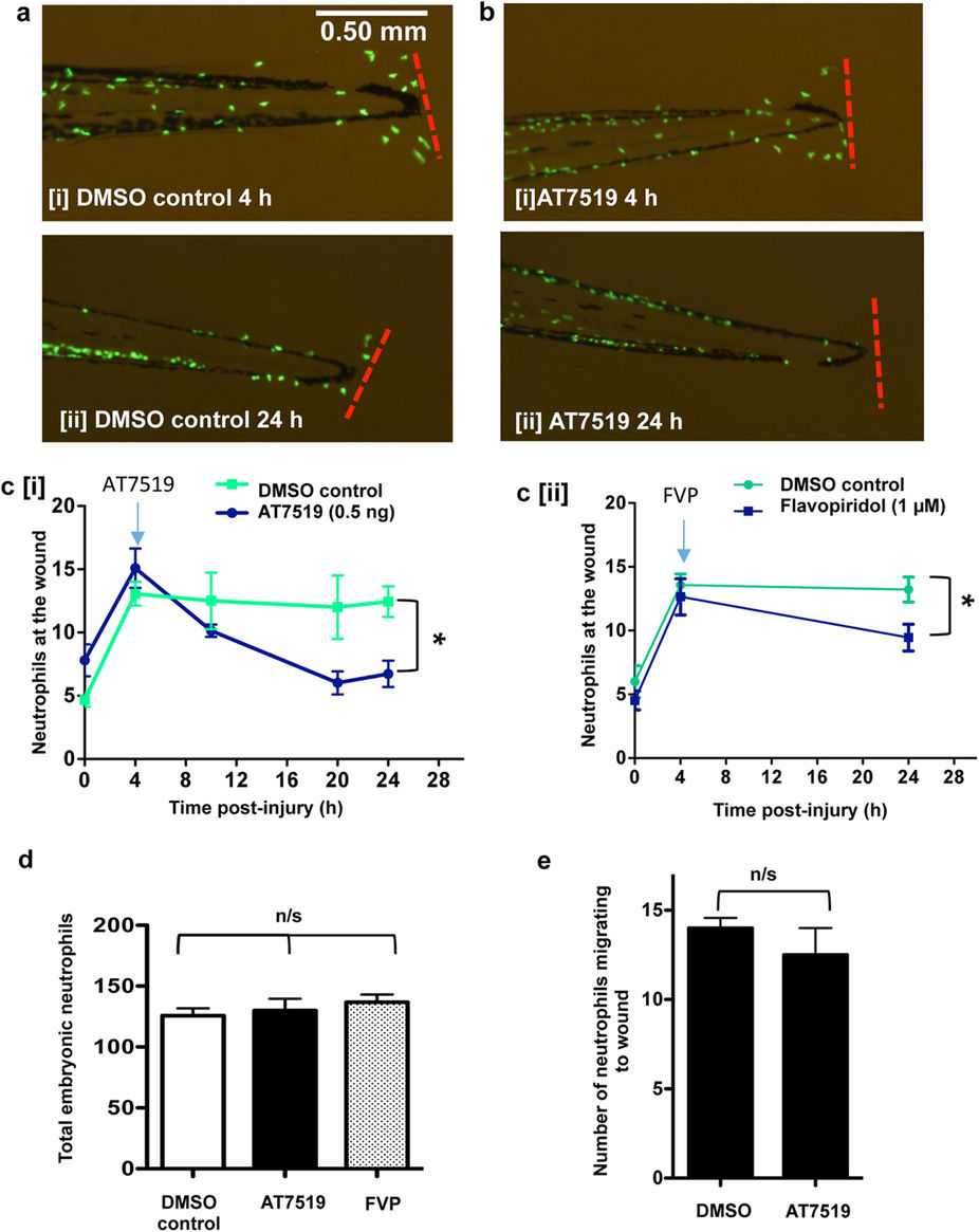 Tg(mpx:EGFP)i114 zebrafish embryos underwent tailfin transection at 3 dpf and were serially imaged at various time points post-injury. (a) Embryos were micro-injected with DMSO or (b) AT7519 at 4 hpi with representative images (80x magnification) from 4 h [i] and 24 h [ii] shown. (c [i]) Serial neutrophil numbers at each tailfin were quantified with the blue arrow indicating the 4 hpi time of drug administration. ≥40 fish from 4 independent experiments. Data expressed as ±SEM. (c [ii]) In separate experiments, Tg(mpx:EGFP)i114 zebrafish embryos were also treated with flavopiridol (FVP) at 4 hpi and the neutrophil numbers at the tailfin quantified. ≥31 fish from 3 independent experiments. (d) The total neutrophils in the entire embryo at 24 hpi and DMSO/AT7519/FVP treatment were imaged and quantified. ≥10 fish from 3 independent experiments. (e) Time lapse movies of embryos (3 per group) were analysed and the number of cells which migrate to the wound for 15 hpi and DMSO/AT7519 treatment was counted. *p < 0.05 at 24 hpi, data analysed by two-way ANOVA then post-test Newman-Keuls or unpaired t-test. n/s: not significant.
