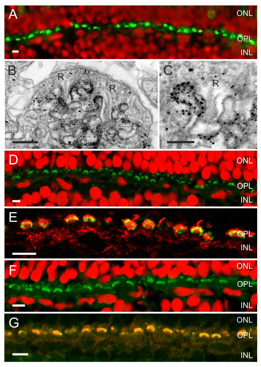 (A) Fluorescent images of zebrafish retina showing Panx1-IR (green) and a nuclear stain (red) (from Prochnow et al. [11]). Panx1-IR is present in characteristic horseshoe-shaped structures indicative for processes invaginating the cone synaptic terminal. (B) Electronmicrograph of a cone synaptic terminal in zebrafish retina. Immunolabeling is restricted to HC dendrites flanking the synaptic ribbons (R). (C) Higher magnification of a HC dendrite lateral of the synaptic ribbon (R). Note that one HC dendrite is devoid of Panx1 labeling. (D) NTPDase1-IR (green) and a nuclear stain (red). NTPDase1-IR is also present in horseshoe-shaped structures characteristic for localization in HC dendrites. (E) Double labeling of NTPDase1 antibody with an antibody against GluR2 (green), a marker for HC dendrites [63],[64], indicated that NTPDase-1 (red) was specifically expressed on HC dendrites. (F) ADA-IR (green) was present in horseshoe-shaped structures. (G) ADA-IR colocalized with the GluR2-IR (green), indicating that ADA (red) is expressed on HC dendrites. Expression of ecto-ATPases in the photoreceptor synaptic terminal has been observed previously in rat [39], mouse, and zebrafish [61]. Scale bars in panels A, D, E, F, and G indicate 5 µm. Scale bar in panels B and C indicate 500 nm and 250 nm, respectively.