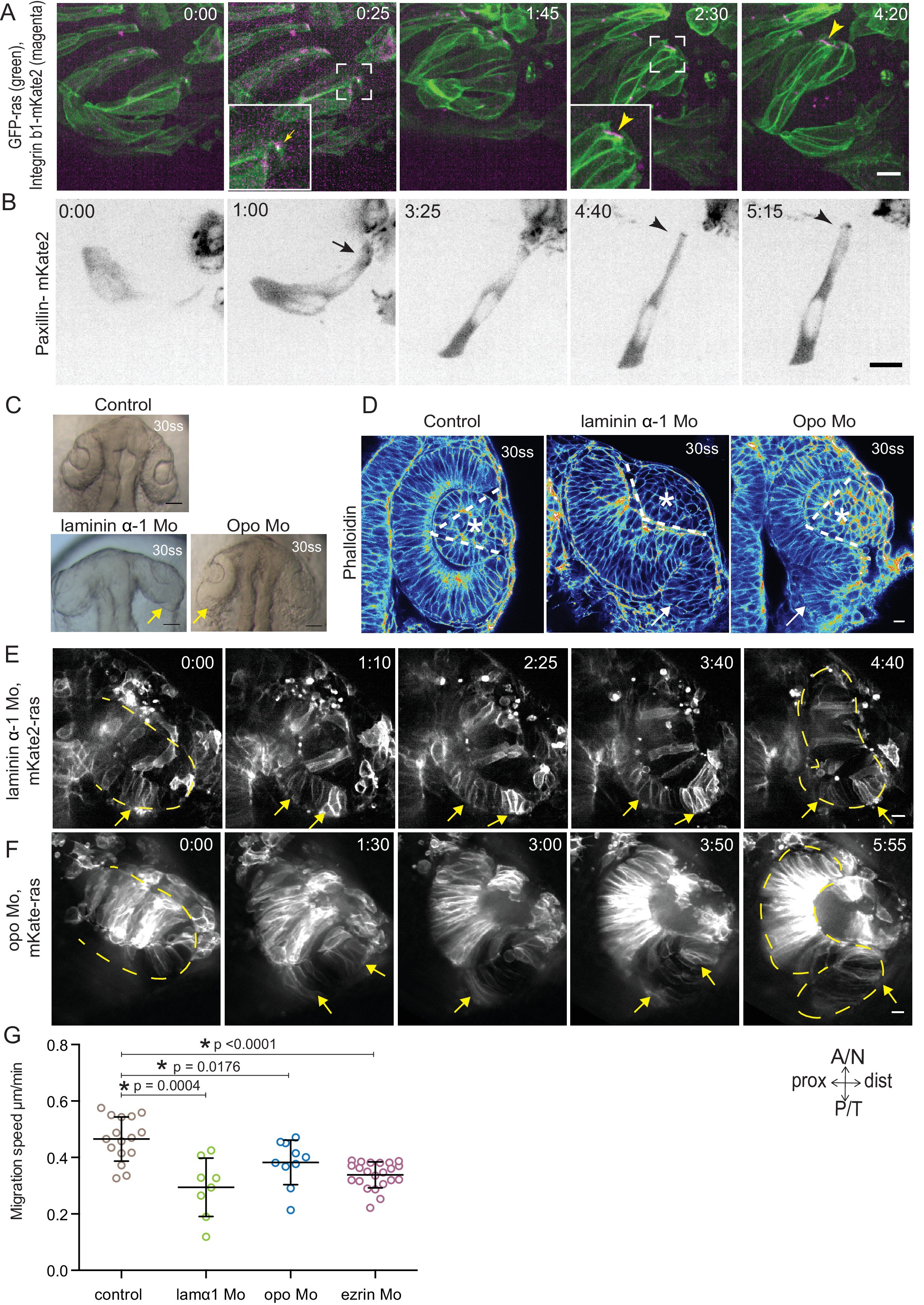 (A) Time-lapse imaging of rim zone with mosaic expression of GFP-ras and Integrin-β1b-mKate2. Inlays show enlarged marked area. Arrow indicates the integrin foci during migration. Arrowheads mark the basally enriched stable integrin pool in the RNE cell. Frames from Video 10. N = 4. Scale bar = 10 µm. Imaging started at 17–18 ss, Time in h:min. (B) Timelapse imaging of rim zone with mosaic expression of paxillin-mKate2. Arrow indicates the short-lived paxillin foci. Arrowhead marks the stable basal paxillin localization in the RNE. Frames from Video 11. N = 6. Scale bar = 10 µm. Imaging started at 17–18 ss. Time in h:min. (C) Brightfield images of the dorsal view of 30 ss embryo head. Control (upper), laminin morphant (lower left) and opo morphant (lower right). Arrows mark the epithelial accumulation outside the RNE. Scale bar = 50 µm. (D) Confocal scan of optic cups at 30 ss stained for phalloidin. Control (left), laminin morphant (middle) and opo morphant (right). Arrows mark the epithelial accumulation outside the RNE. Dashed lines indicate the angle of invagination. Asterisk marks the developing lens. Lookup table indicates the minimum and maximum intensity values. Scale bar = 10 µm. (E,F) Time-lapse imaging of RNE morphogenesis in laminin morphant (E) and Opo morphant (F) injected mosaically with mKate2-ras RNA. Arrows mark rim cells that failed to move. Dashed line marks the outline of the developing RNE. Frames from Videos 13 and 14. Time in h:min. Scale bar = 10 µm. Movies started at 16 ss-17 ss. (G) Migration speed of rim cells (Mean ± SD). P values for Mann Whitney test with control: laminin Mo p=0.0004, opo Mo p=0.0176, ezrin Mo p<0.0001. See Figure 4—source data 2.