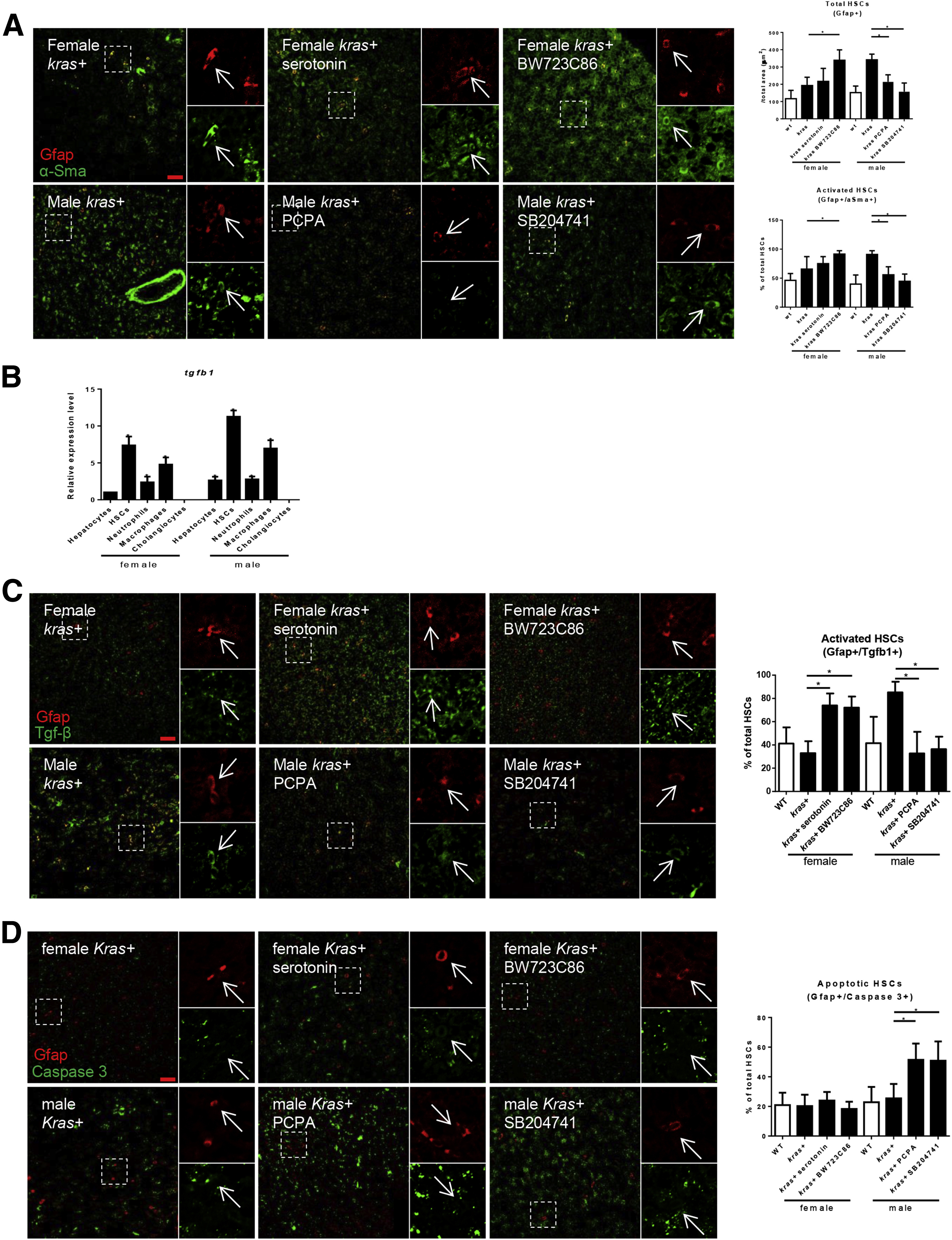 Manipulation of serotonin level and HSC density affects HSC activation and apoptosis. (A) IF staining and quantification of HSC density (Gfap+) in liver sections (n > 8 in each group). Three-month-old adult zebrafish were treated with dox with or without serotonin, BW23C86, PCPA, and SB204741 for 7 days. Percentages of activated HSCs (Gfap+/α-Sma+) in the liver sections (n > 8 in each group). (B) Expression of tgfb1 in hepatocytes, HSCs, neutrophils, macrophages, and cholangiocytes. These cells were isolated by fluorescence-activated cell sorting based on DsRed, GFP, DsRed, mCherry, and GFP expression, respectively, from fabp10+, hand2+, lyz+, mpeg+, and tp1+ transgenic zebrafish. Total RNAs were extracted and htr2b expression was determined by reverse-transcription quantitative PCR. Relative expression levels are with the values with female hepatocytes set as 1. (C and D) IF staining and quantification of percentages of (C) TgfB1+ HSCs (Gfap+/Tgfb1+) and (D) apoptotic HSCs in the liver sections as described in panel A. n > 8 in each group. *P < .05. Scale bar: 20 μm.