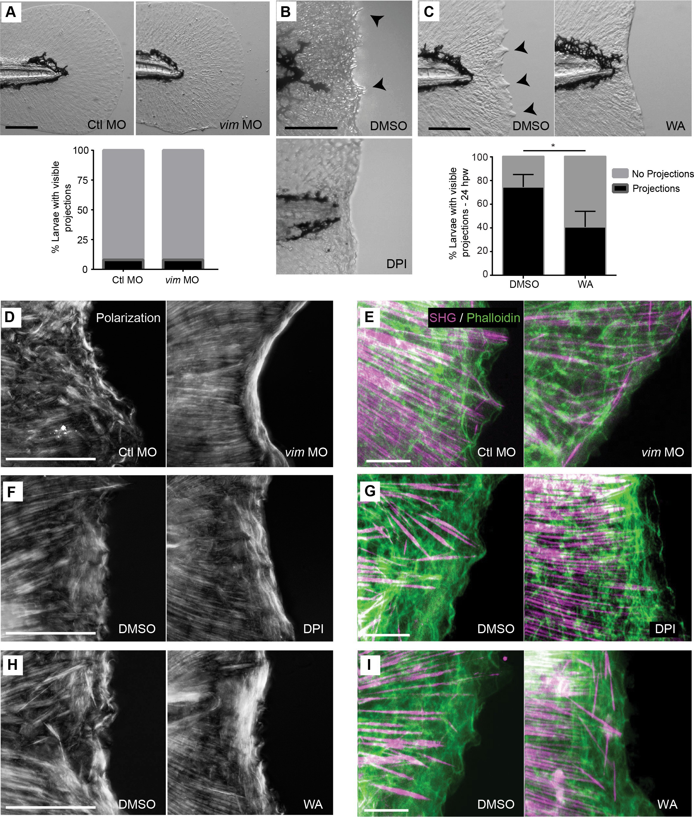 (A) Unwounded larvae rarely formed projections during development. (B) Representative bright field images of early ROS-inhibited and DMSO-control caudal fins at 24 hpw. (C) Early inhibition using WA significantly reduced projection formation at 24 hpw. (D, F, H) Polarization microscopy indicated a lack of projections in vimentin-deficient, ROS-inhibited, and WA treated larvae, respectively, at 24 hpw. (E, G, I) Z projections of SHG imaging and phalloidin labeling of the wound edge at 24 hpw in vimentin-deficient, ROS-inhibited, and WA treated larvae support the reduction of projection formation with these treatments. Data in A represents a single experiment and data in C represents data pooled from four replicates. Scale bars in A-D, F, and H represent 100 µm and E, G, and I represent 20 µm. *p<0.05.