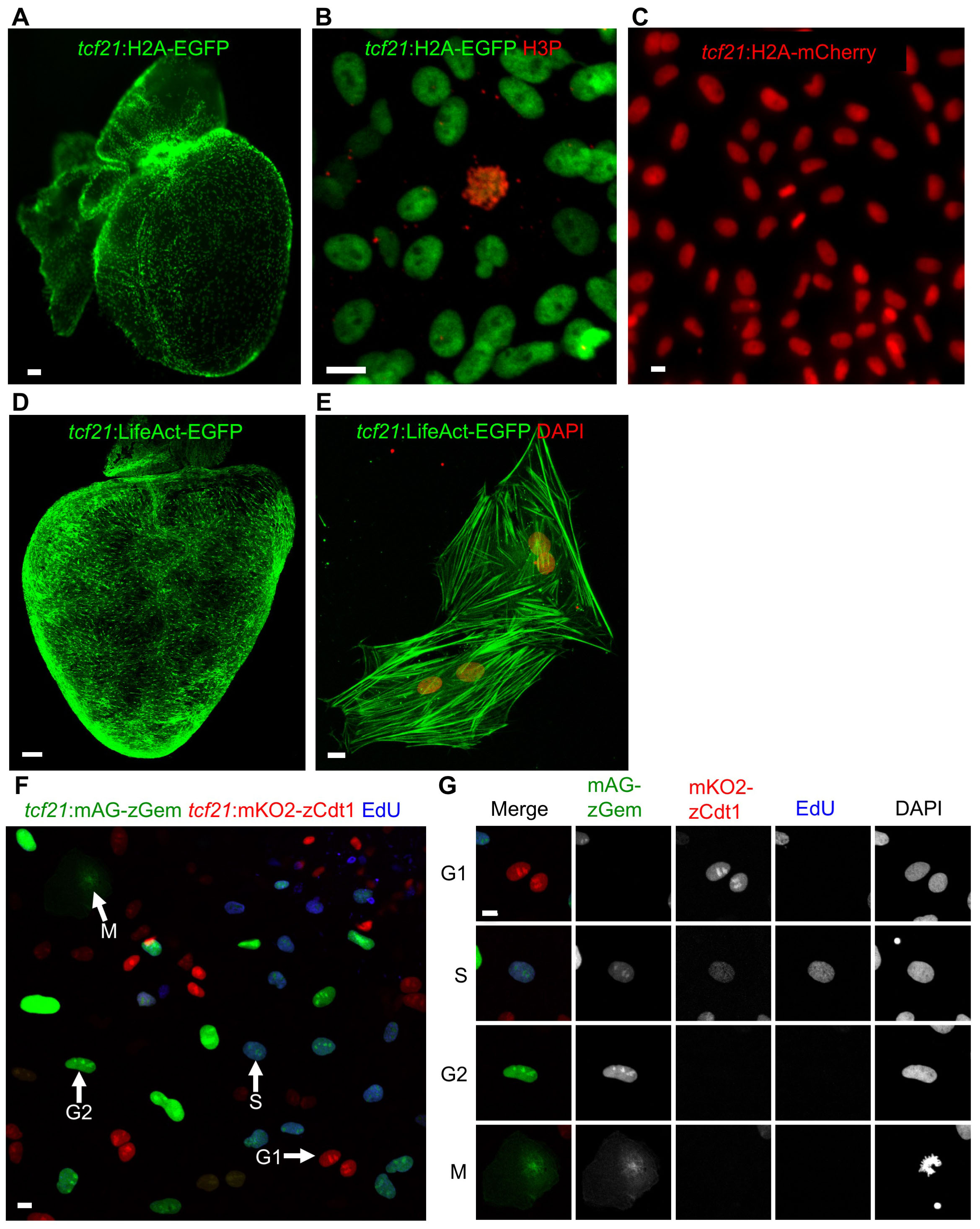 (F, G) Epicardial explant culture from a tcf21:FUCCI heart, stained after a 1 h pulse of EdU to mark S phase. Arrows in (F) denotes different cell cycle phases, also highlighted in (G). Scale bars, 10 μm.
