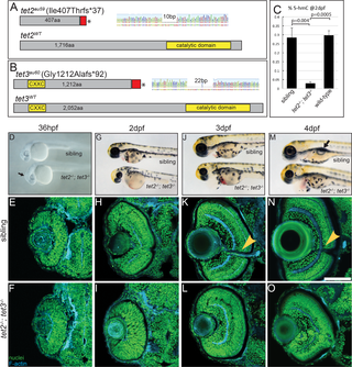 (A) tet2au59 mutants possess a 10bp deletion resulting in a frameshift, insertion of 37 incorrect aa’s (red), and a premature stop codon, truncating the protein at amino acid (aa) 444 of 1,716aa. (B) tet3au60 mutants possess a 22bp deletion, resulting in a frameshift, insertion of 92 incorrect aa’s (red), and a premature stop codon, truncating the protein at aa 1,304 of 2,052. (C) Genomic DNA isolated from 2dpf tet2-/-;tet3-/- mutants shows a >9 fold reduction in global 5hmC levels when compared to phenotypically wild-type siblings and genetically wild-type embryos in an ELISA (n = 20 embryos, p = 0.004 and p = 0.0005, respectively; Error bars = ± 1 S.D.). (D) At 36hpf, tet2-/-;tet3-/- mutants are identifiable based on a kinked head and slightly enlarged brain (arrow). (E,F) Retinae of 36hpf tet2-/-;tet3-/- mutants are morphologically similar to wild-types. (G) At 2dpf, tet2-/-;tet3-/- mutants are microphthalmic, possess cardiac edema and their heads are smaller than phenotypically wildtype siblings. (H-I) The retina is not laminated, with retinal cells appearing progenitor-like in morphology when compared to phenotypically wild-type siblings. (J) Cardiac edema becomes progressively enlarged at 3dpf in tet2-/-; tet3-/- embryos. (K,L) The retina remains poorly laminated in tet2-/-;tet3-/- mutants, and they lack a morphologically obvious optic nerve (arrowhead in sibling). (M) A 4dpf tet2-/-; tet3-/- embryos do not possess an inflated swim bladder (arrow). (N,O) The retina remains poorly laminated and they lack a morphologically obvious optic nerve (arrowhead in sibling). DNA (green), F-actin (cyan). Dorsal is up and anterior to the left. Scale bar = 80μm.