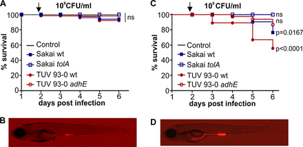 EHEC ingestion causes dose-dependent and strain-specific mortality in zebrafish. Zebrafish at 4 dpf were infected with 108 CFU/ml (A and B) or 109 CFU/ml (C and D) of EHEC (Sakai wt, blue full squares; Sakai tolA, empty squares; TUV 93-0 wt, red filled circles; TUV adhE, red empty circles) or left uninfected (black line below tolA data) and incubated at 32°C for up to 6 dpi. Fish were assessed for vital signs (presence of movement or heartbeat or circulation) every 24 h, and percent survival was plotted using Kaplan-Meier analysis (n = 15 fish per condition, over three independent experiments). Statistical significance was assessed using a Mantel-Cox test. Images of fish infected with EHEC wild-type Sakai::mCherry were taken at 21 hpi (as indicated by an arrow in each survival graph).