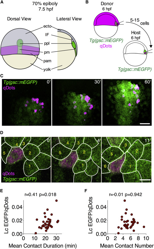 (C) Representative images of ppl cells transplanted from a Tg(gsc::mEGFP) embryo injected with qDots into a Tg(gsc::mEGFP) non-injected embryo. Transplantation was performed at shield stage (6 hpf) and images were taken between 60% epiboly stage (6.5 hpf) and 70% epiboly stage (7.5 hpf). Scale bar, 50 μm.